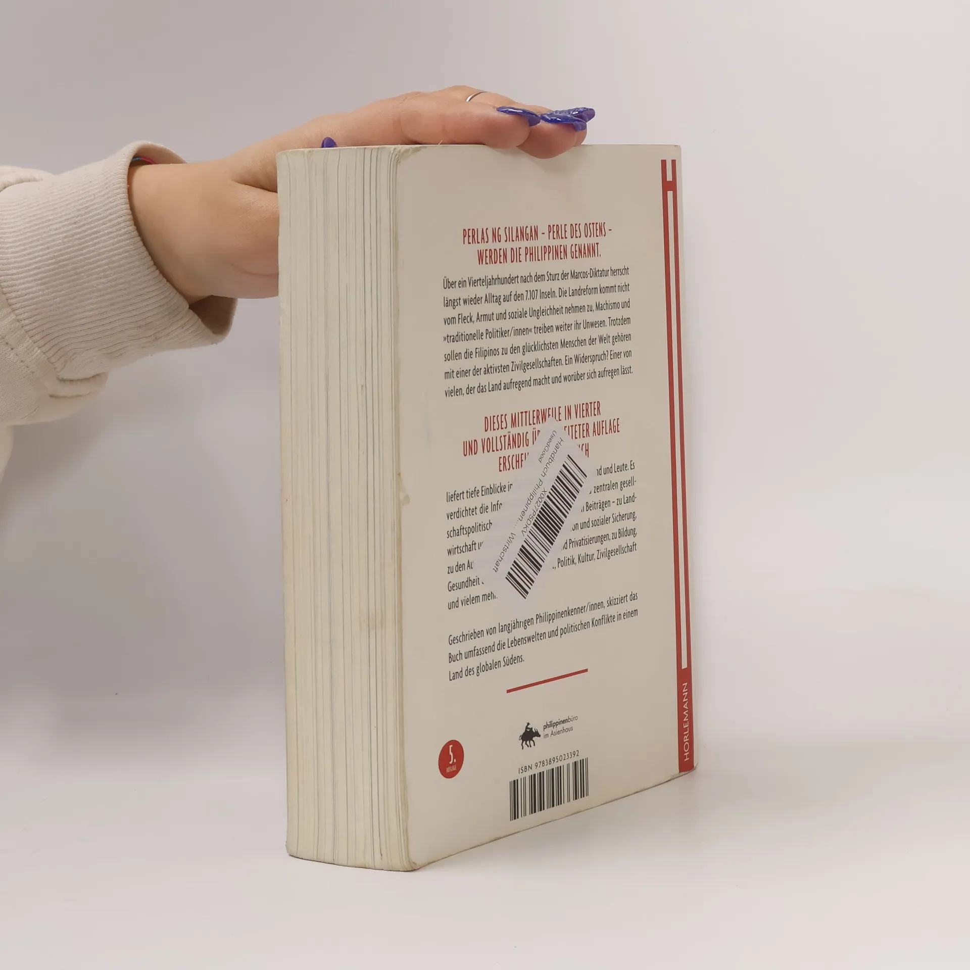 Perlas na Silangan – Perle des Ostens – werden die Philippinen genannt. Das gesellschaftspolitische Handbuch, das nunmehr bereits in vierter, vollständig überarbeiteter und aktualisierter Auflage erscheint, liefert einen kompakten Einblick in Geschichte und Gegenwart, Land und Leute. Es verdichtet die Informationen und Diskussionen zu zentralen gesellschaftspolitischen Problemfeldern in zahlreichen Beiträgen – zu Landwirtschaft und Landreform, zu Arbeitsmigration und sozialer Sicherung, zu Bildung, Gesundheit und Gender, Wirtschaft, Politik, Zivilgesellschaft und vielem mehr. Geschrieben von langjährigen PhilippinenkennerInnen skizziert das Buch die Lebenswelten und politischen Kämpfe in einem Land des globalen Südens. Es soll den LeserInnen dabei behilflich sein, eigene Einblicke zu unternehmen beziehungsweise zu vertiefen und neue Erkenntnisse zu gewinnen. Darüber hinaus möchte es bei zahlreichen Menschen Interesse für die Philippinen wecken sowie eventuelle touristische Erfahrungen bereichern.