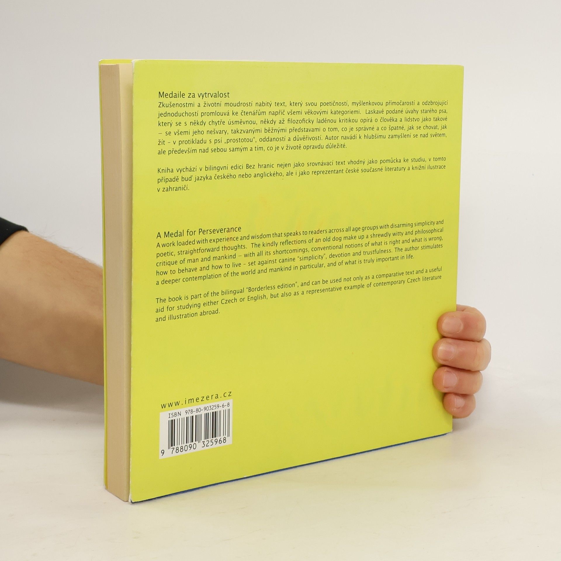 Monolog a laskavé úvahy starého psa, které s odzbrojující jednoduchostí hovoří o lidech a psech, přivádějí k zamyšlení se nad sebou, světem okolo a tím, co je v životě opravdu důležité. "Psí úvahy" vidí člověka se všemi jeho nešvary, takzvanými správnými představami o tom, co je dobře a co špatně, jak žít, jak se chovat – v protikladu s psí „jednoduchostí‶, oddaností a logikou. Příběh, který svou přímočarostí promlouvá ke čtenářům napříč všemi věkovými kategoriemi a přinutí bez jakýchkoliv apelů zpomalit a (možná po dlouhé době) se usmát na svět kolem něj. Podle autora si právě pes pro neustálou snahu "unést svůj náklad / a splynout s přirozeným tokem života" zasluhuje pomyslnou medaili za vytrvalost. "Byla by to medaile za nepromarněný život." Ħesko–anglické vydání, knihu doplňují barevné ilustrace, podtrhující charakter textu.