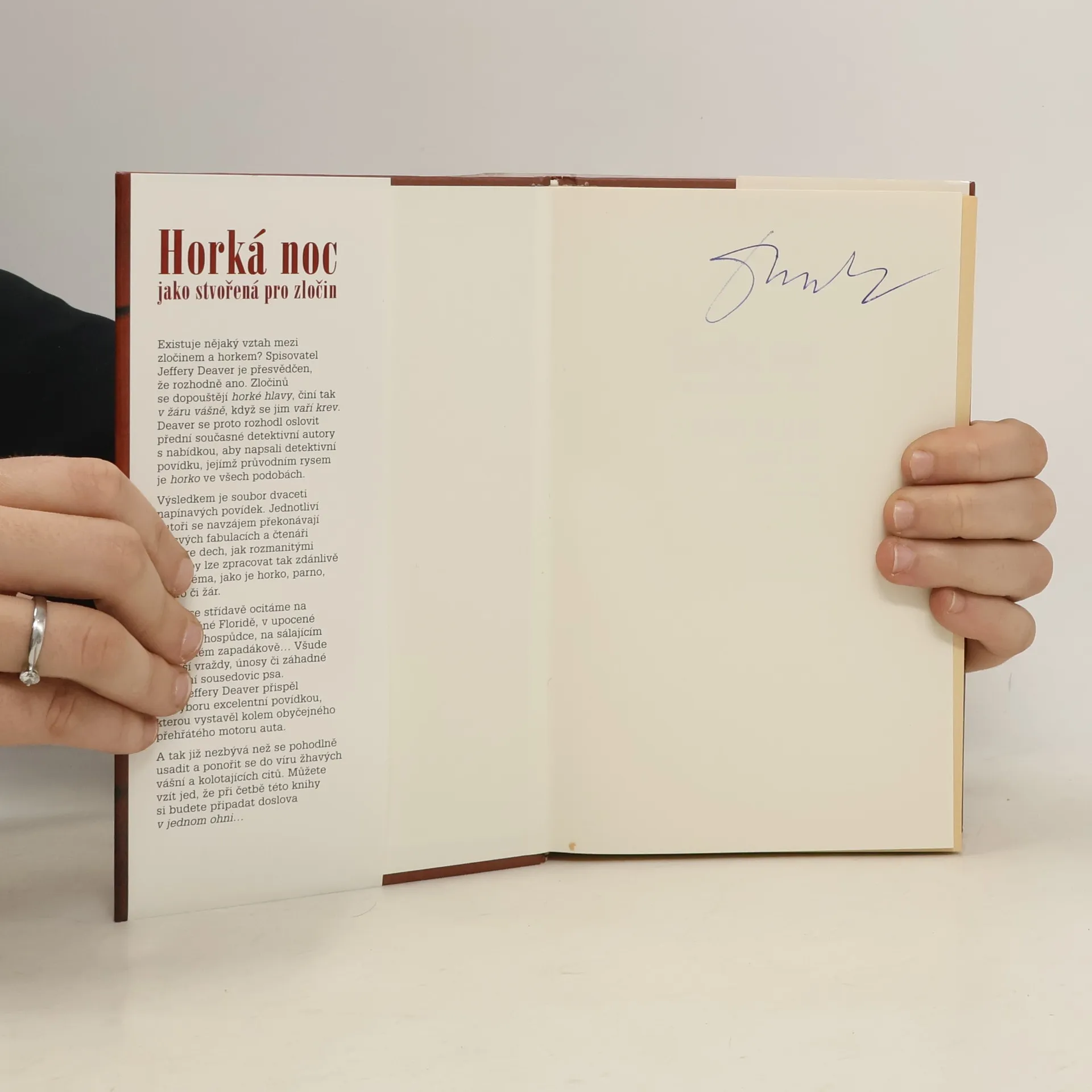 Existuje vztah mezi zločinem a horkem? Jeffery Deaver je přesvědčen, že ano. Zločinu se dopouštějí horké hlavy, v žáru vášně, když jim vaří krev. Proto oslovil dvacítku autorů, aby napsali detektivní povídku s horkem jako hlavním prvkem. Výsledkem je výjimečný soubor, kde autoři překonávají sami sebe v neuvěřitelných fabulacích, a čtenář je ohromen, jak rozmanitě lze zpracovat zdánlivě fádní téma. Příběhy nás zavedou na prosluněnou Floridu, do dusné mexické hospůdky či na sálající americký zapadákov. Řeší se vraždy, únosy a zmizení sousedovic psa, a čtenář je pokaždé překvapen nečekaným rozuzlením. Jeffery Deaver přispěl excelentní povídkou, jejíž děj se točí kolem přehřátého motoru auta. Ponořte se do víru žhavých vášní a kolotajících citů – při četbě této knihy se budete cítit doslova v jednom ohni!