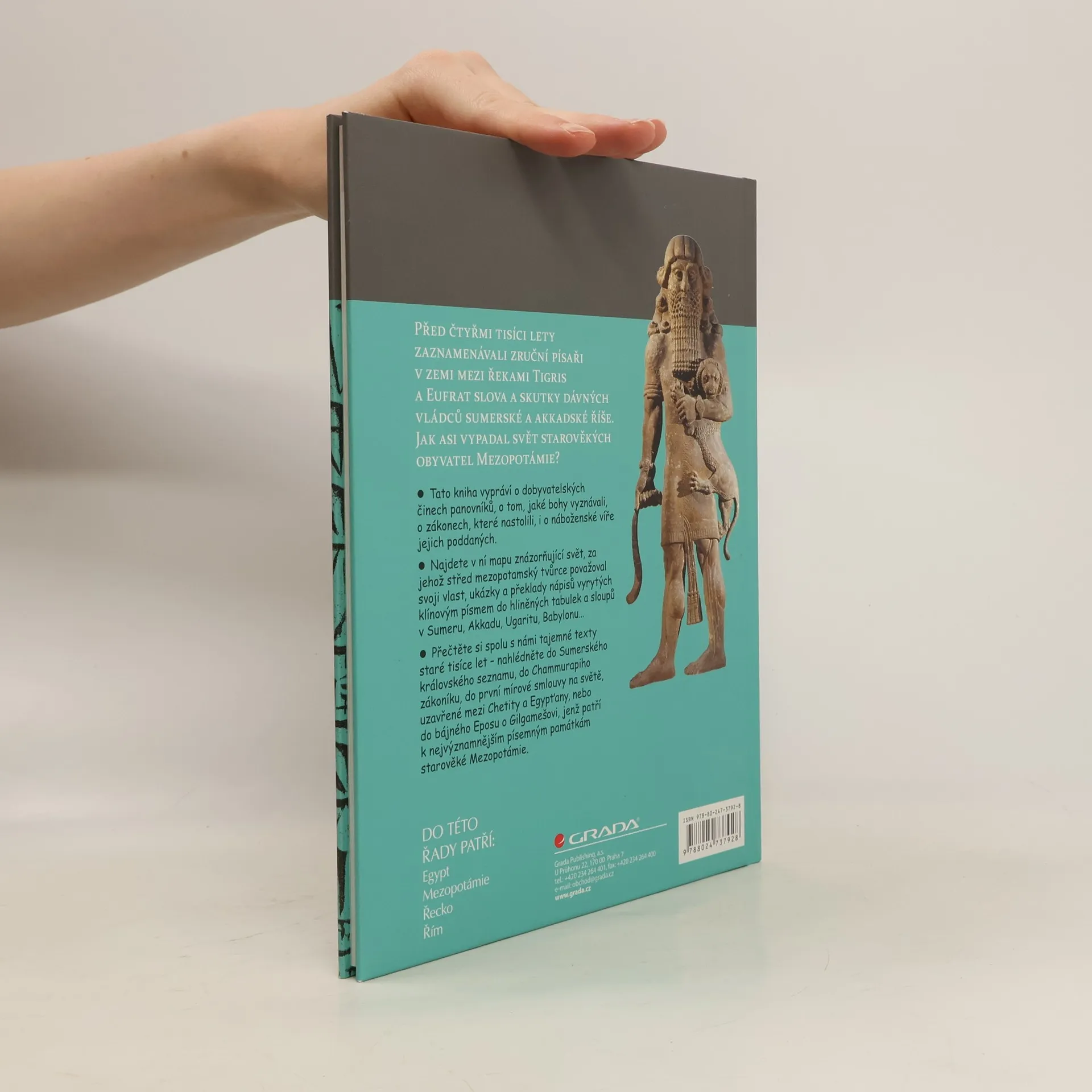 Před čtyřmi tisíci lety zaznamenávali zruční písaři v zemi mezi řekami Tigris a Eufrat slova a skutky dávných vládců sumerské a akkadské říše. Jak asi vypadal svět starověkých obyvatel Mezopotámie? Tato kniha vypráví o dobyvatelských činech panovníků, o tom, jaké bohy vyznávali, o zákonech, které nastolili, i o náboženské víře jejich poddaných. Najdete v ní mapu znázorňující svět, za jehož střed mezopotamský tvůrce považoval svoji vlast, ukázky a překlady nápisů vyrytých klínovým písmem do hliněných tabulek a sloupů v Sumeru, Akkadu, Ugaritu, Babylonu… Přečtěte si spolu s námi tajemné texty staré tisíce let – nahlédněte do Sumerského královského seznamu, do Chammurapiho zákoníku, do první mírové smlouvy na světě, uzavřené mezi Chetity a Egypťany, nebo do bájného Eposu o Gilgamešovi, jenž patří k nejvýznamnějším písemným památkám starověké Mezopotámie.