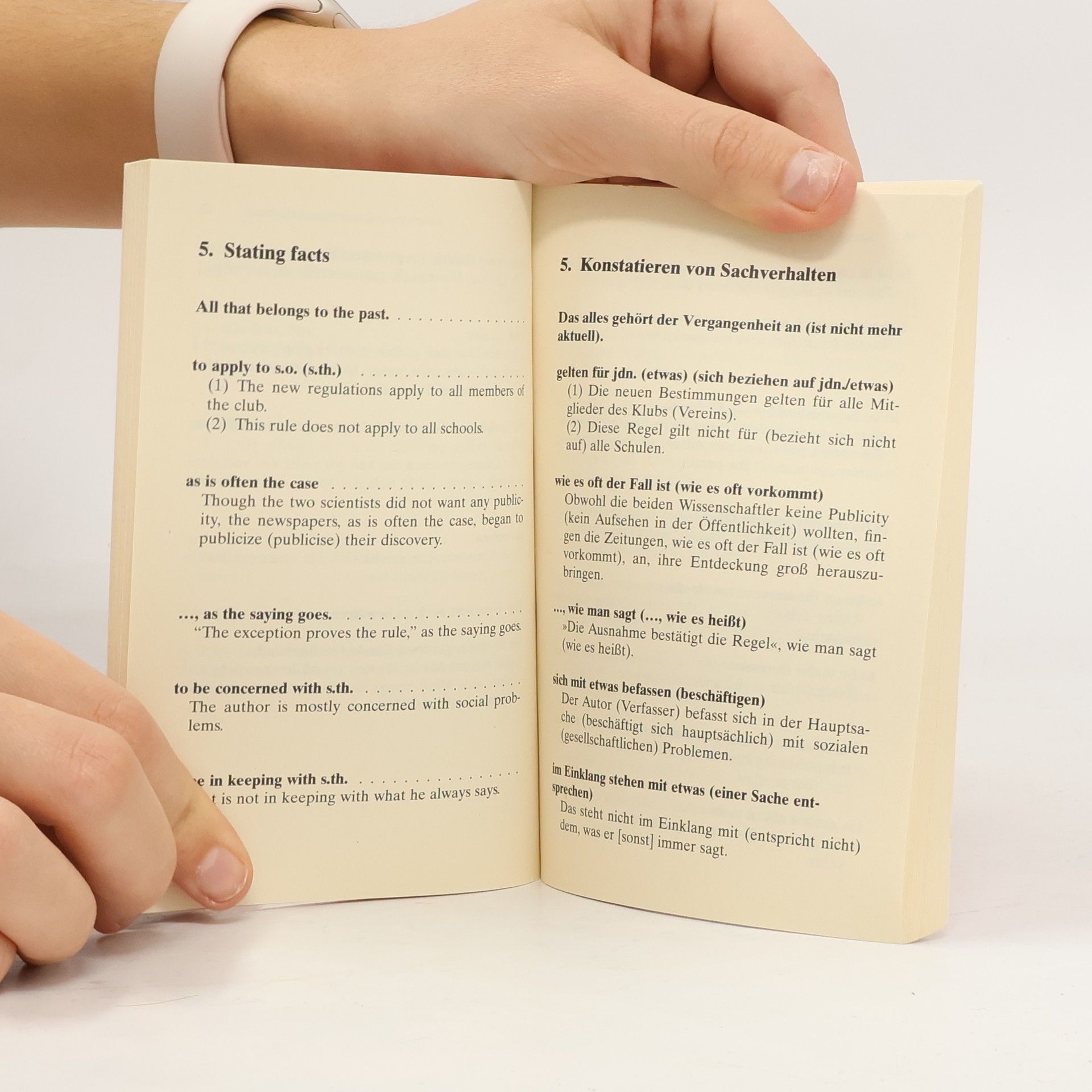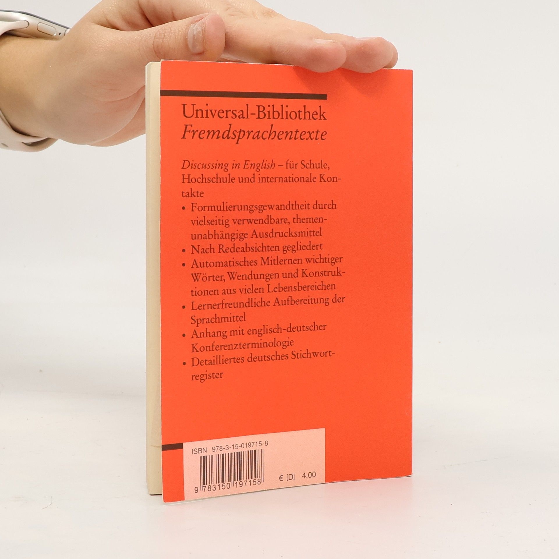 Eine Zusammenstellung wichtiger Ausdrücke für jede auf Englisch geführte Diskussion. Gegliedert ist das Buch in 10 Lerneinheiten wie ›Häufig gebrauchte Wendungen‹ oder ›Meinungsäußerung‹. Auf jede Wendung folgt ein Beispielsatz, links steht jeweils das Englische, rechts die deutsche Übersetzung. Ein letztes Kapitel enthält Formulierungen zur Organisation von Konferenzen und Sitzungen. Englische Lektüre: Niveau B1–B2 (GER)