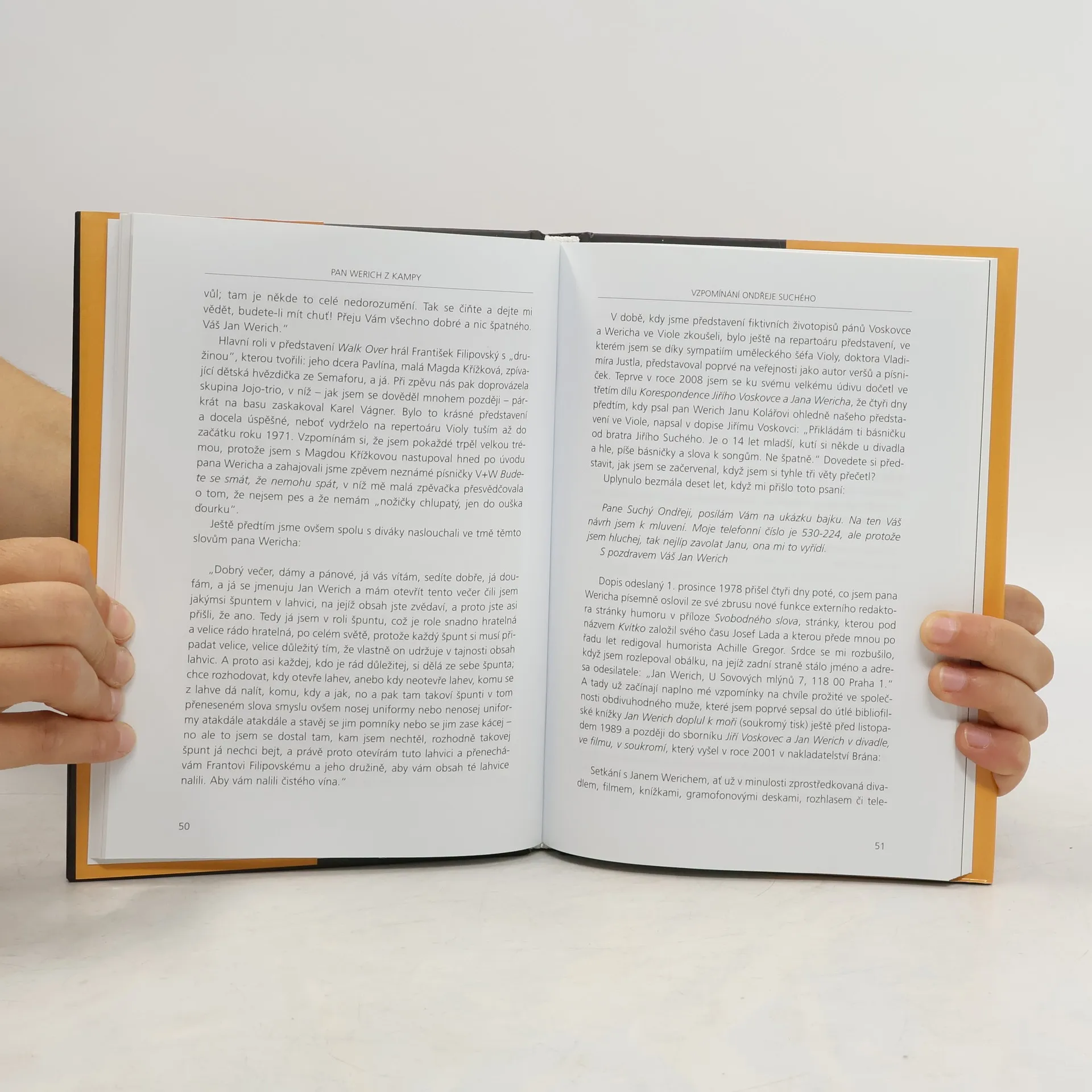 Bratři Jiří a Ondřej Suchých se nezávisle na sobě setkávali na Kampě s Janem Werichem. O těchto setkáních vydávali během uplynulých třech desetiletích svědectví v řadě článků, úvah a knižních kapitol, které teď shrnuli a doplnili o další vzpomínání. Kniha, kterou vydává nakladatelství Ikar obsahuje řadu dosud nikde nezveřejněných a často unikátních fotografií.