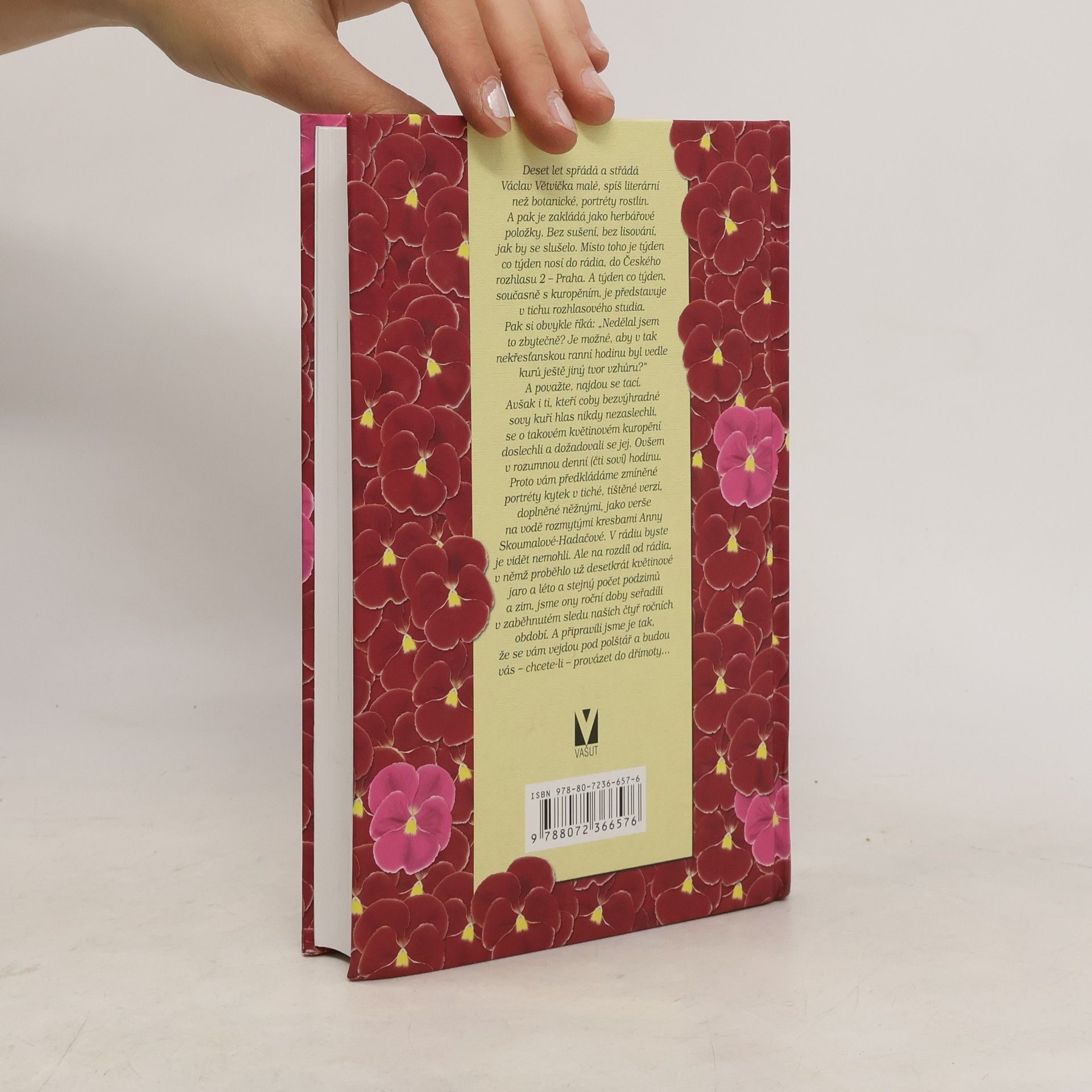 Deset let spřádá a střádá Václav Větvička malé, spíš literární než botanické, portréty rostlin. A pak je zakládá jako herbářové položky. Bez sušení, bez lisování, jak by se slušelo. Místo toho je týden co týden nosí do rádia, do Českého rozhlasu 2 - Praha. A týden co týden, současně s kuropěním, je představuje v tichu rozhlasového studia. Pak si obvykle říká: "Nedělal jsem to zbytečně? Je možné, aby v tak nekřesťanskou ranní hodinu byl vedle kurů ještě jiný tvor vzhůru?" A považte, najdou se tací. Avšak i ti, kteří coby bezvýhradné sovy kuří hlas nikdy nezaslechli, se o takovém květinovém kuropění doslechli a dožadovali se jej. Ovšem v rozumnou denní (čti soví) hodinu. Proto vám předkládáme zmíněné portréty kytek v tiché, tištěné verzi, doplněné něžnými, jako verše na vodě rozmytými kresbami Anny Skoumalové-Hadačové. V rádiu byste je vidět nemohli. Ale na rozdíl od rádia, v němž proběhlo už desetkrát květinové jaro a léto a stejný počet podzimů a zim, jsme ony roční doby seřadili v zaběhnutém sledu našich čtyř ročních období. A připravili jsme je tak, že se vám vejdou pod polštář a budou vás - chcete-li - provázet do dřímoty.