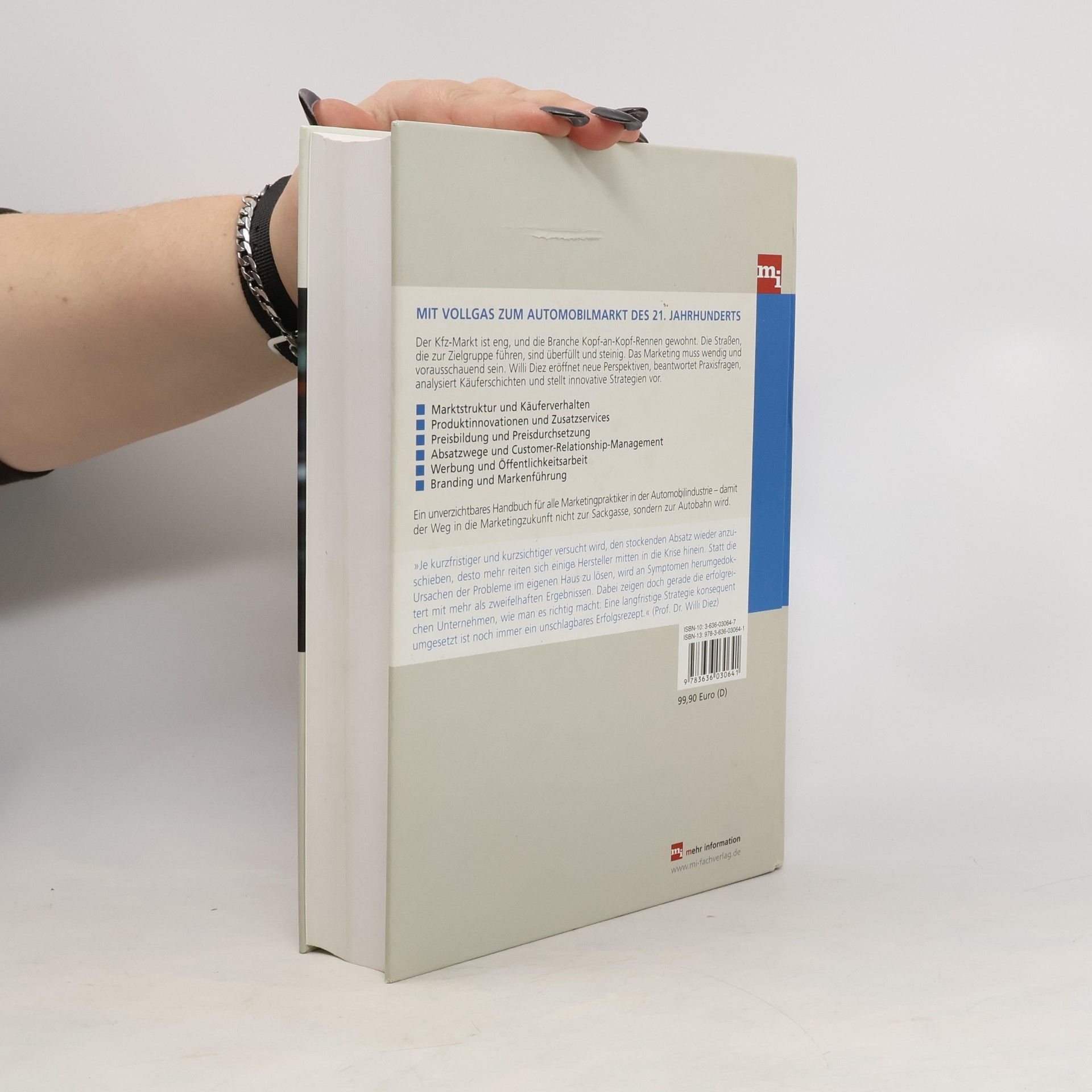 Tuning und viele Extras: das Standardwerk für Marketingfachleute in der Automobilindustrie. Der Kfz-Markt ist eng, und die Branche Kopf-an-Kopf-Rennen gewohnt. Die Straßen, die zur Zielgruppe führen, sind überfüllt und steinig. Das Marketing muss wendig und vorausschauend sein. Willi Diez eröffnet neue Perspektiven, beantwort Praxisfragen, analysiert Käuferschichten und stellt innovative Strategien vor. Die Themen: Absatzwege, Marktstrukturen, Käuferverhalten, Preisgestaltung, Werbung, Kommunikation und vieles mehr. Mit zahlreichen Fallbeispielen.