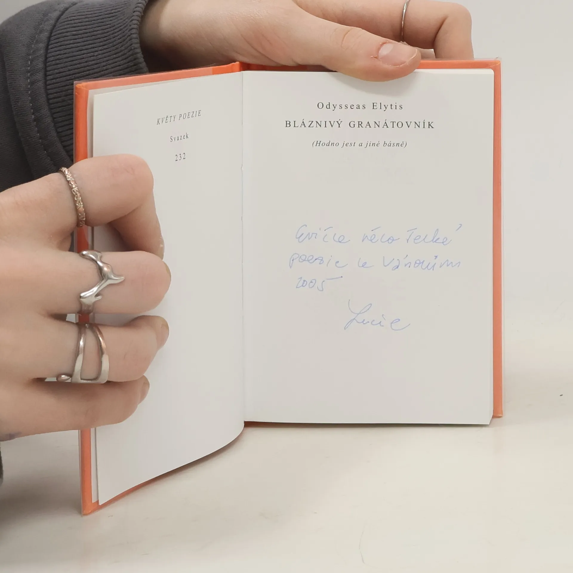 Výbor z poezie řeckého nositele Nobelovy ceny (1979) Odyssea Elytise (1911-1996), nejvýznamnějšího novořeckého básníka z generace symbolistů a surrealistů 30. let. Ve své poezii, okouzlené sluncem a světlem řecké přírody, Elytis záměrně narušuje tradiční gramatiku a syntaktickou strukturu a sbírky veršů zpravidla doprovází vlastními fotografickými kolážemi.