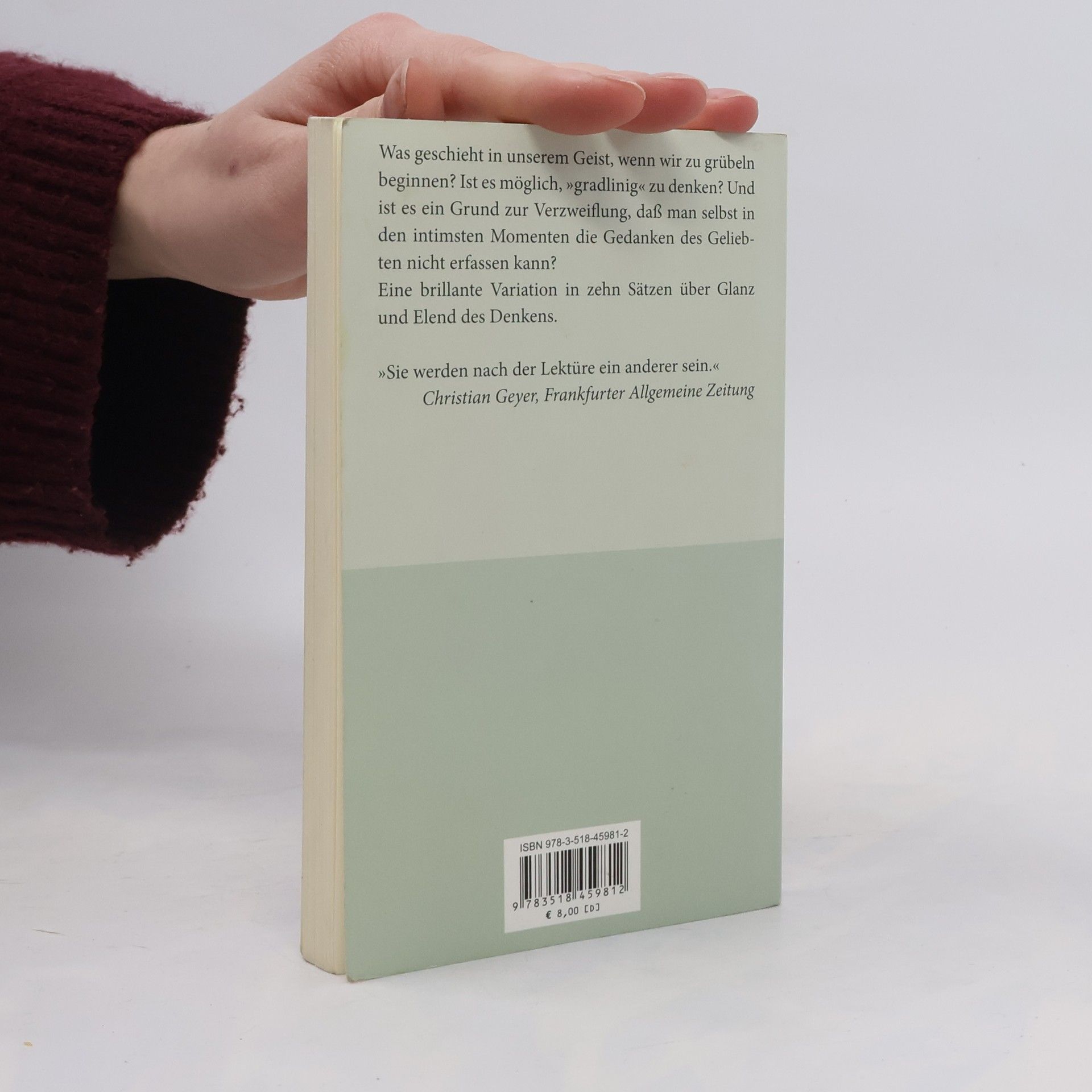 Einen brillanten Essay, eine Variation in zehn Sätzen über Glanz und Elend des Denkens legt George Steiner hier vor. Was geschieht in unserem Geist, wenn wir zu grübeln beginnen? Ist es möglich, „gradlinig“ zu denken? Und ist es ein Grund zur Verzweiflung, daß man selbst in Momenten größter Intimität die Gedanken des Geliebten nicht erfassen kann?