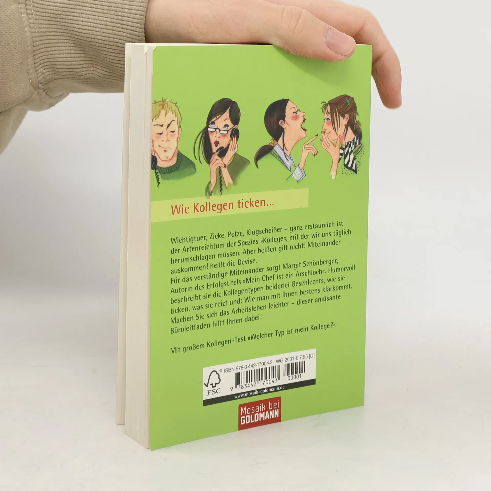 Pflichtlektüre für jeden Arbeitnehmer Wichtigtuer, Zicke, Petze, Klugscheißer – ganz erstaunlich ist der Artenreichtum der Spezies „Kollege“. Beißen gilt nicht! Miteinander auskommen! heißt die Devise. Für das verständige Miteinander sorgt Margit Schönberger. Humorvoll beschreibt sie die Kollegentypen beiderlei Geschlechts, wie sie ticken, was sie reizt und: Wie man mit ihnen bestens klarkommt. Der amüsante Büroleitfaden zum Schmunzeln und Wiedererkennen. Mit Test „Welcher Typ ist mein Kollege?“.