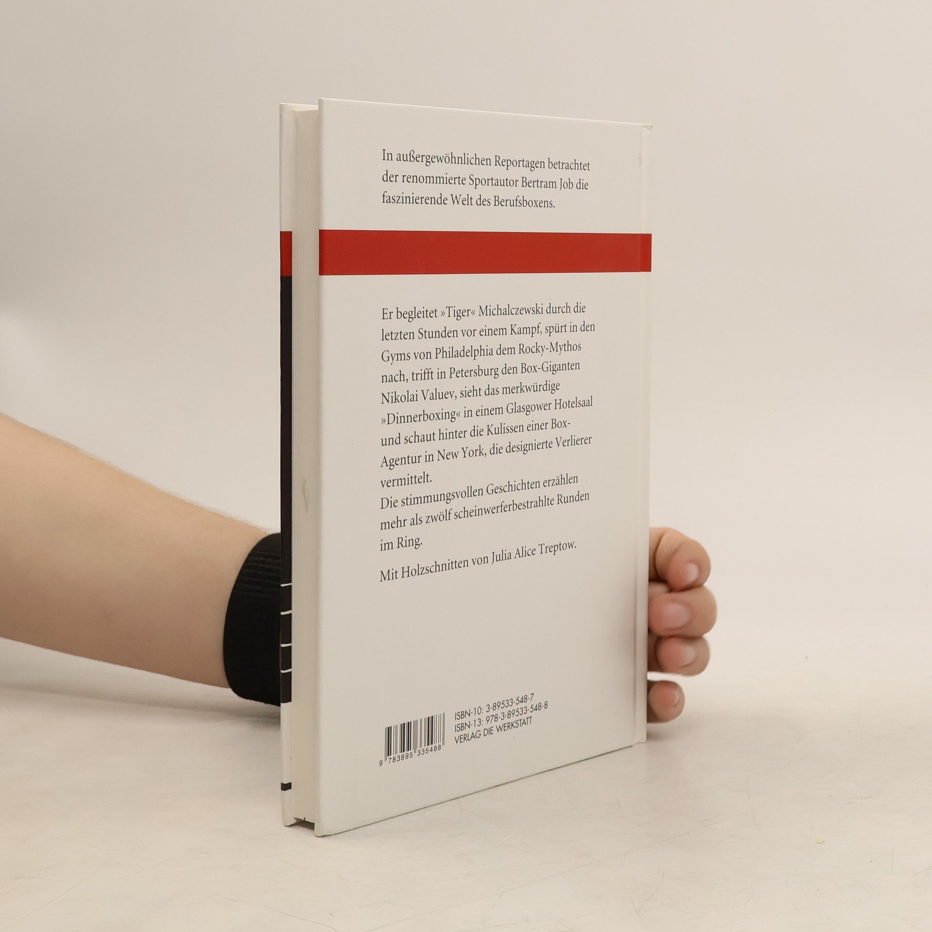 „Jenseits des Scheinwerferlichts bietet das Boxen oft die interessantesten und spannendsten Geschichten. Seit vielen Jahren schon schreibt darüber der Journalist Bertram Job. Er begleitete Dariusz “„Tiger“„ Michalczewski durch die letzten Stunden vor einem wichtigen Kampf, er beobachtete 80-jährige Amateurboxer in Dortmund, er sah das merkwürdige “„Dinnerboxing“„ in einem Glasgower Hotel, und er besuchte eine obskure Agentur in Manhattan, die designierte Verlierer für Boxkämpfe vermittelt. Jobs Reportagen erscheinen in renommierten Zeitungen wie Die Zeit, FAZ, Süddeutsche oder Stern. Seine besten Beiträge stellte er jetzt zu einem Buch zusammen, das ungewöhnliche Einblicke in die facettenreiche Welt des Boxsports vermittelt. Jede Geschichte wird illustriert mit speziell für dieses Buch gestalteten Holzschnitten der Hamburger Künstlerin Julia Alice Treptow.“
