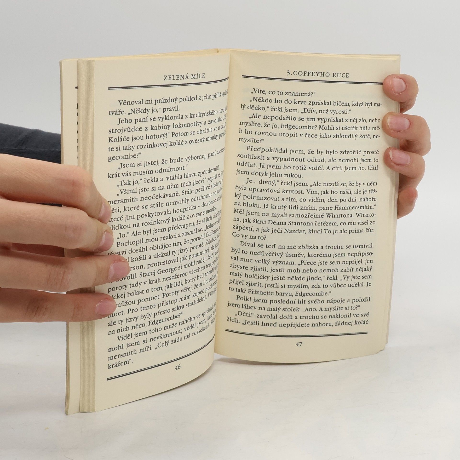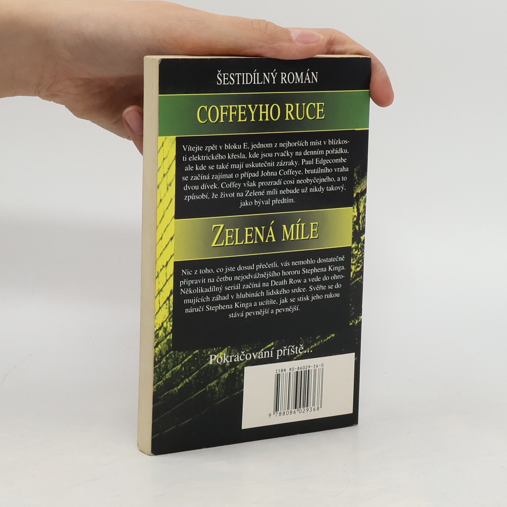 Vítejte zpět v bloku E, jednom z nejhorších míst v blízkosti elektrického křesla, kde jsou rvačky na denním pořádku, ale kde se také mají uskutečnit zázraky. Paul Edgecombe se začíná zajímat o případ Paula Coffeye, brutálního vraha dvou dívek. Coffey však prozradí cosi neobyčejného, co způsobí, že život na Zelené míli nebude už nikdy takový, jako býval předtím. Nic z toho, co jste dosud přečetli, vás nemohlo dostatečně připravit na četbu nejodvážnějšího hororu Stephena Kinga. Několikadílný seriál začíná na Death Row a vede do ohromujících záhad v hlubinách lidského srdce. Svěřte se do náručí Stephena Kinga a ucítíte, jak se stisk jeho rukou stává pevnější a pevnější.