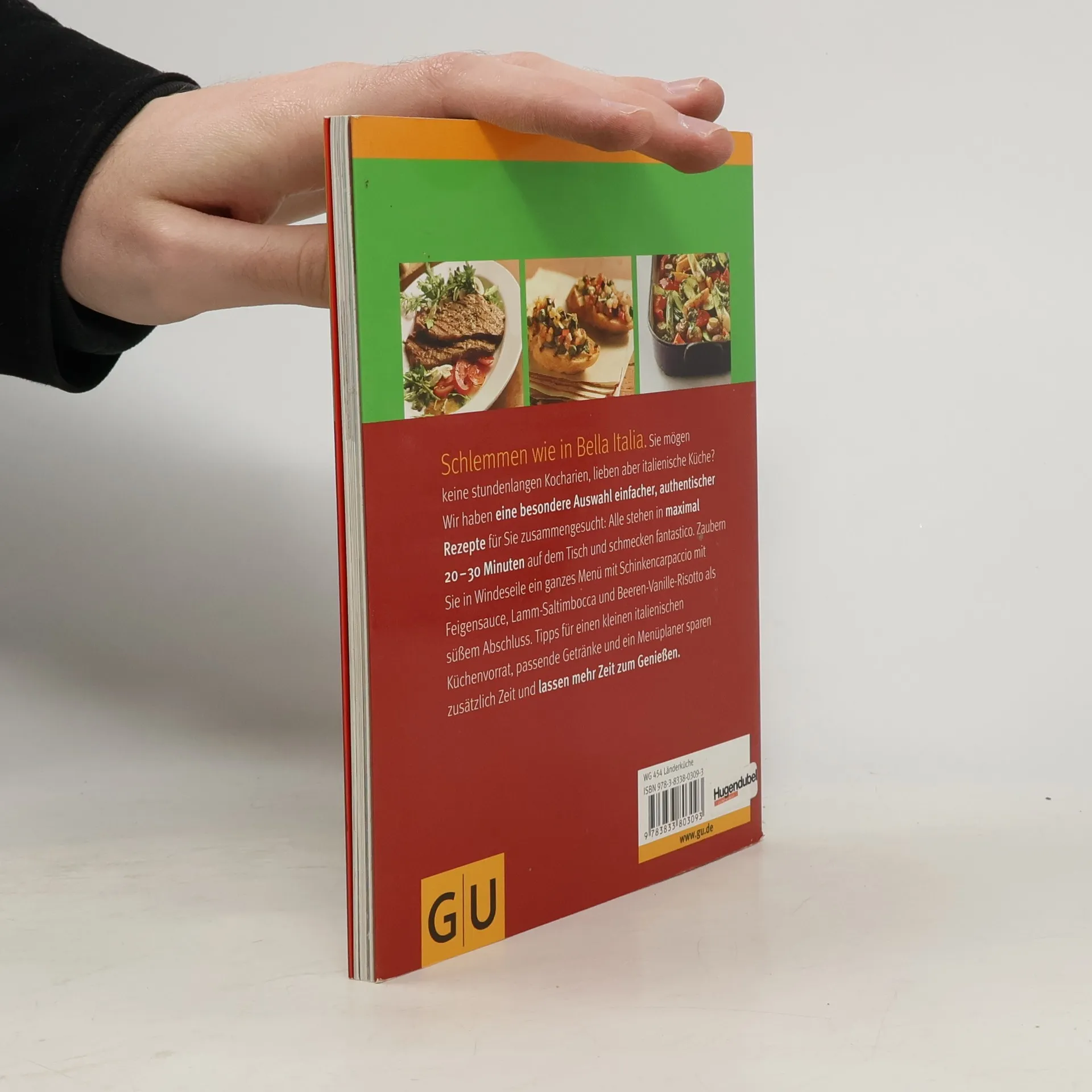 Kochen und genießen wie in Bella Italia - aber bloß nicht so lange am Herd stehen wie Mamma mia. Wer glaubt, dass gute italienische Küche gleichzeitig stundelange Kocharien bedeutet, wird hier eines Besseren belehrt. Um kulinarisch nach Italien zu gelangen, braucht es nicht mehr als 20 bis maximal 30 Minuten. In so kurzer Zeit gelingen alle mit viel Liebe und Sachverstand ausgewählten Rezepte. So lässt sich dann auch gleich ein ganzes Menü für Freunde und die Familie auftischen: Vom edlen Schinkencarpaccio mit Feigensauce über Pasta mit Safranerbsen bis Lamm-Saltimbocca oder Fisch in Kapernbutter mit Beeren-Vanille-Risotto zum krönenden Abschluss. Tipps für den kleinen italienischen Vorrat helfen noch etwas mehr Zeit zu sparen, die sich dann bestens in den Getränktipps und Vorschlägen für italienische Blitzmenüs investieren lässt.