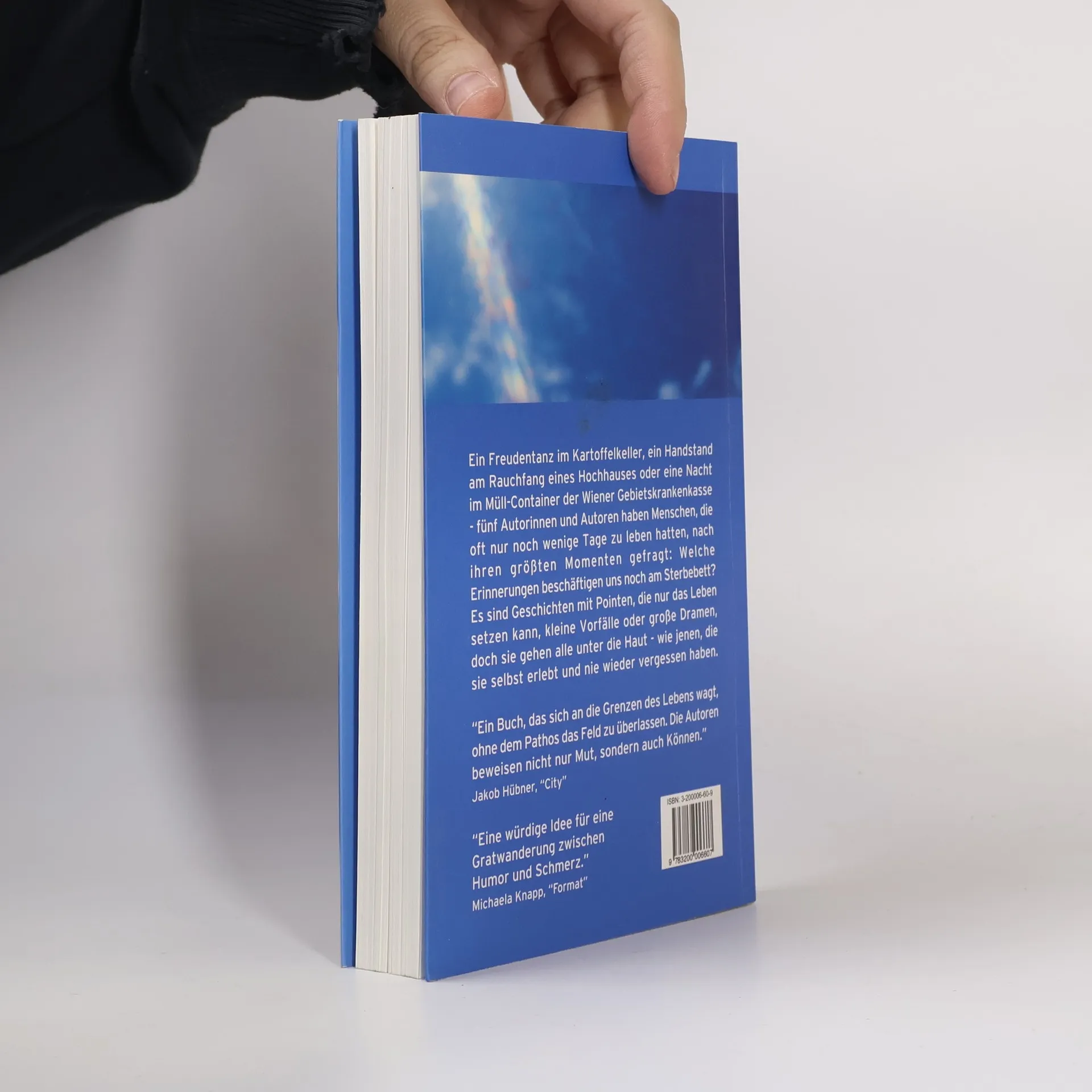 Ein Freudentanz im Kartoffelkeller, ein Handstand am Rauchfang eines Hochhauses oder eine Nacht im Müll-Container der Wiener Gebietskrankenkasse - fünf Autorinnen und Autoren haben Menschen, die oft nur noch wenige Tage zu leben hatten, nach ihren größten Momenten gefragt: Welche Erinnerungen beschäftigen uns noch am Sterbebett? Es sind Geschichten mit Pointen, die nur das Leben setzen kann. Viele handeln von Kleinigkeiten, doch sie gehen alle unter die Haut - wie jenen, die sie selbst erlebt und nie wieder vergessen haben Mehr als vierzig Interviews mit Menschen in Hospizeinrichtungen haben die fünf Autorinnen und Autoren dieses Buches geführt. Teils fanden sie unter schwierigsten Bedingungen statt, weil die Gesprächspartner von Alter oder Krankheit schon schwer gezeichnet waren. Wohl gerade deshalb ist es ein kraftvolles Buch über das Leben geworden: Geschichte für sich ist die Essenz eines individuellen Schicksals, auf den Punkt gebracht in einer kleinen Episode. Die Autorinnen und Autoren sind dabei wie schon im ersten Buch dieser Verlagsreihe, „17 Jahre ohne Sex – Geschichten aus einem Wiener Stundenhotel“, auf dem schmalen Grat zwischen Journalismus und Belletristik gewandelt. Die von ihnen beschriebenen Begebenheiten haben tatsächlich stattgefunden, und trotzdem sind sie voller überraschender Wendungen und Pointen, und spannender, als es fiktive Kurzgeschichten überhaupt sein könnten.
