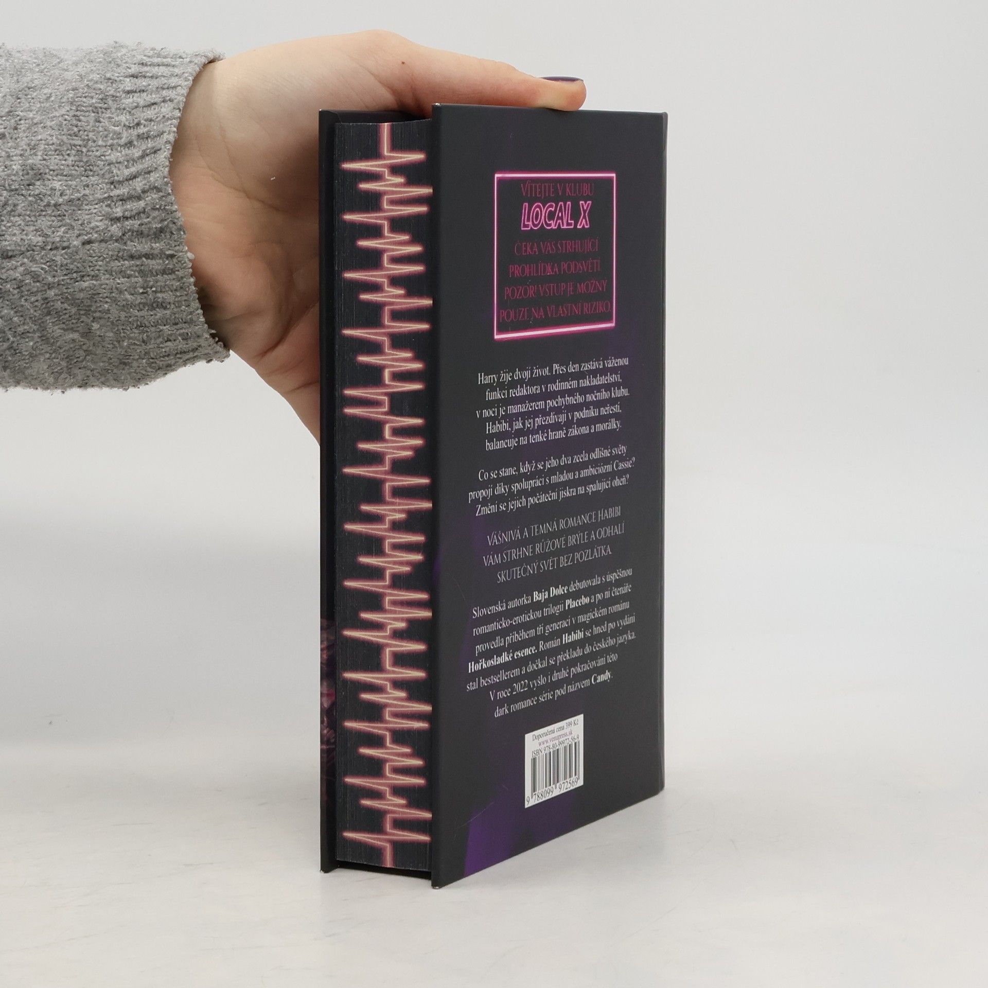 Vítejte v klubu LocalX. Čeká vás strhující prohlídka podsvětí. Pozor! Vstup je možný pouze na vlastní riziko. Harry žije dvojí život. Přes den zastává váženou funkci redaktora v rodinném nakladatelství, v noci je manažerem pochybného nočního klubu. Habibi, jak jej přezdívají v podniku neřestí, balancuje na tenké hraně zákona a morálky. Co se stane, když se jeho dva zcela odlišné světy propojí díky spolupráci s mladou a ambiciózní Cassie? Změní se jejich počáteční jiskra na spalující oheň? Vášnivá a temná romance Habibi vám strhne růžové brýle a odhalí skutečný svět bez pozlátka. Slovenská autorka Baja Dolce debutovala s úspěšnou romanticko-erotickou trilogií Placebo a po ní čtenáře provedla příběhem tří generací v magickém románu Hořkosladké esence. Román Habibi se hned po vydání stal bestsellerem a dočkal se překladu do českého jazyka. V roce 2022 vyšlo i druhé pokračování této dark romance série pod názvem Candy.