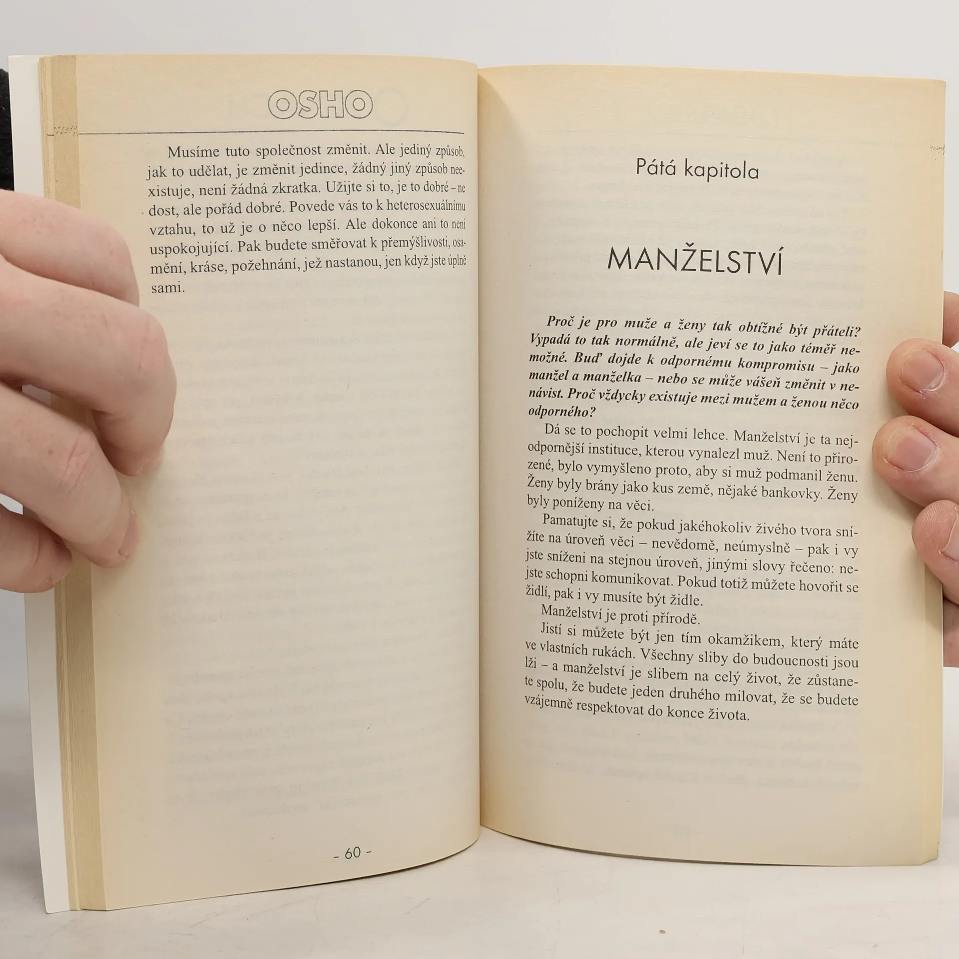 Velký guru odpovídá na otázky týkající se témat žena-muž, feminismus, sexualita, homosexualita, manželství, láska, vztah, mateřství. "Když si milenci navzájem říkají - nemůžu bez tebe žít, není to o tom, že by se podváděli, myslí to vážně. Ale neznají podstatu života. Zítra to bude tatáž žena, ale nebude vypadat tak krásně. A v průběhu dalších dní se oba, muž i žena, budou cítit uvězněni."
