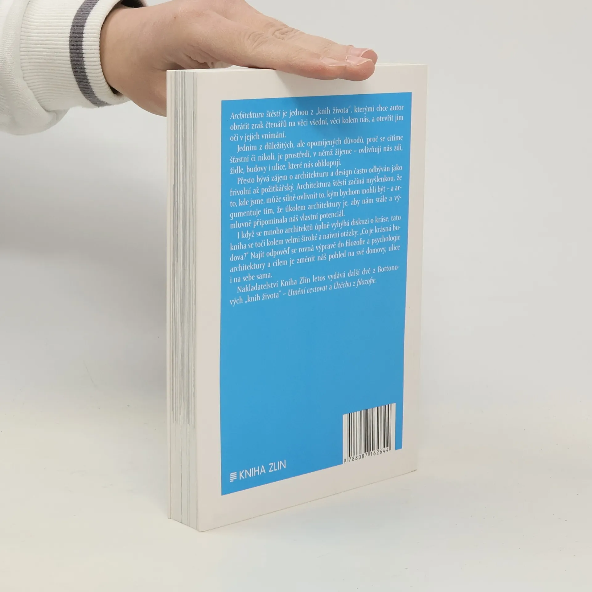 Architektura štěstí je jednou z „knih života“, kterými chce autor obrátit zrak čtenářů na věci všední, věci kolem nás a otevřít jim oči v jejich vnímání. Jedním z důležitých, ale opomíjených důvodů, proč se cítíme šťastní či nikoli, je prostředí, v němž žijeme – ovlivňují nás zdi, židle, budovy i ulice, které nás obklopují. Přesto bývá zájem o architekturu a design často odbýván jako frivolní až požitkářský. Architektura štěstí začíná od myšlenky, že to kde jsme, může silně ovlivnit to, kým bychom mohli být – a argumentuje tím, že je úkolem architektury je, aby nám stále a výmluvně připomínala náš vlastní potenciál. I když se mnoho architektů úplně vyhýbá diskuzi krásy, tato kniha se točí kolem velmi široké a naivní otázky „Co je krásná budova?“ Najít odpověď se rovná výpravě do filozofie a psychologie architektury a cílem je změnit náš pohled na naše domovy, ulice i na sebe sama. Ve vydavatelství Kniha Zlín vychází také další z „knih života“, Umění cestovat a Útěcha ve filozofii.