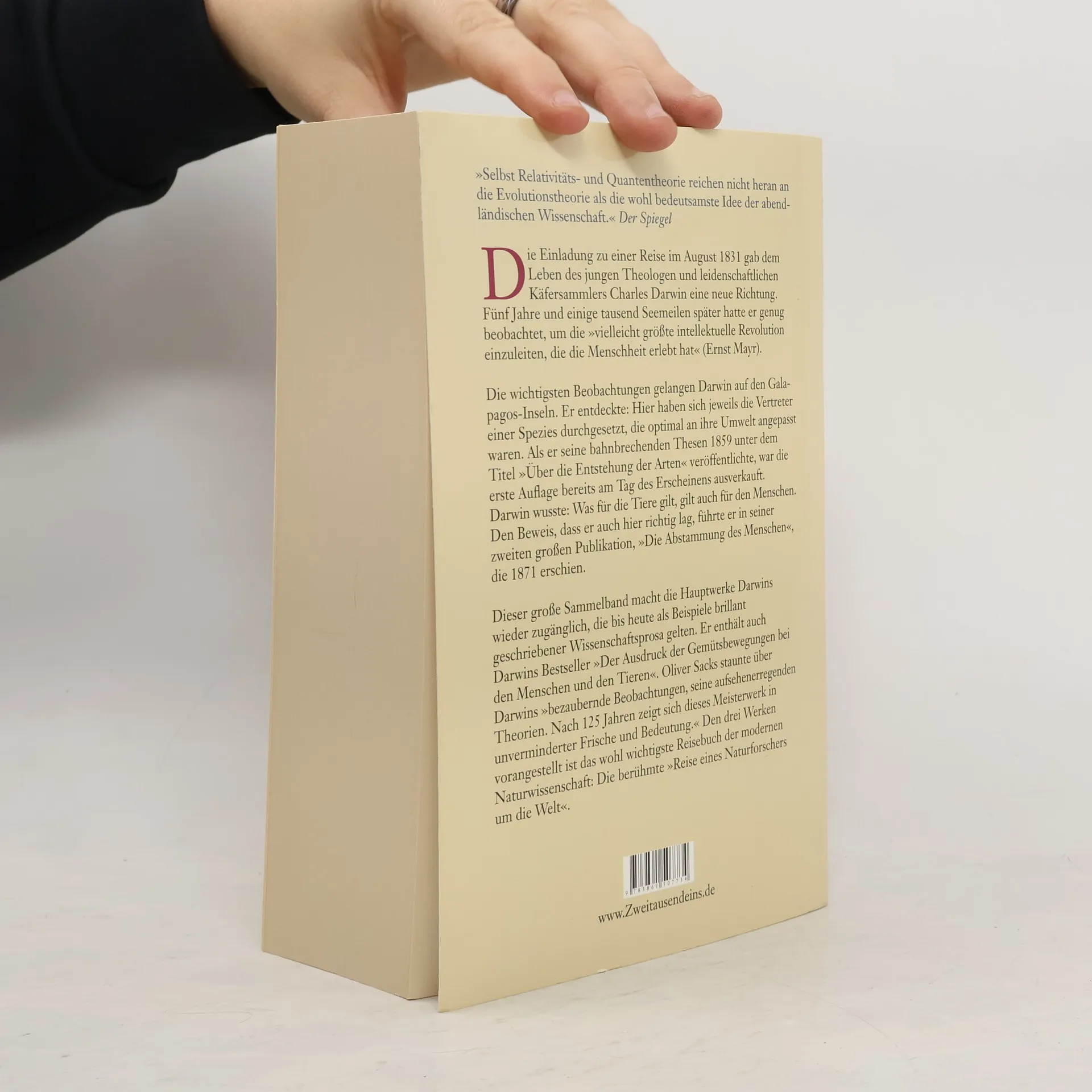 Die Einladung zu einer Reise im August 1831 veränderte das Leben des jungen Theologen und Käfersammlers Charles Darwin. Fünf Jahre später hatte er genug beobachtet, um eine der bedeutendsten intellektuellen Revolutionen einzuleiten. Besonders prägend waren seine Beobachtungen auf den Galapagos-Inseln, wo er erkannte, dass sich jeweils die Vertreter einer Spezies optimal an ihre Umwelt anpassten. Als er 1859 seine bahnbrechenden Thesen veröffentlichte, war die erste Auflage am Erscheinungstag ausverkauft. Darwin war sich bewusst, dass diese Prinzipien auch für den Menschen galten, was er in seiner zweiten großen Publikation von 1871 nachwies. Dieser Sammelband macht Darwins Hauptwerke wieder zugänglich, die als brillante Beispiele wissenschaftlicher Prosa gelten. Darin enthalten ist auch sein Bestseller über den Ausdruck von Emotionen bei Menschen und Tieren, der von Oliver Sacks für seine bezaubernden Beobachtungen und Theorien gelobt wurde. Vorangestellt ist das bedeutende Reisebuch der modernen Naturwissenschaft: die berühmte „Reise eines Naturforschers um die Welt“. Die Evolutionstheorie wird als die wohl bedeutsamste Idee der abendländischen Wissenschaft angesehen, die selbst mit Relativitäts- und Quantentheorie nicht zu vergleichen ist.
