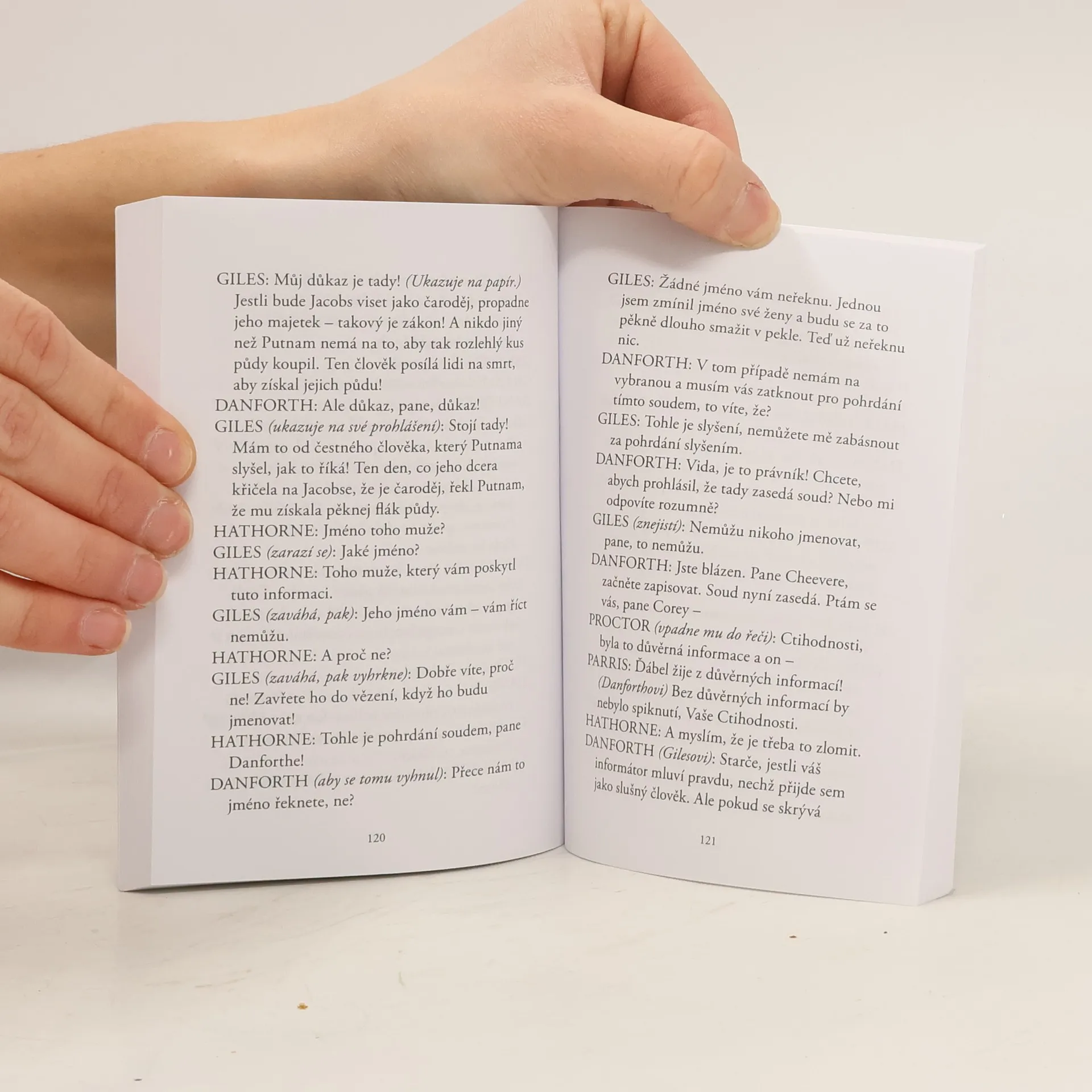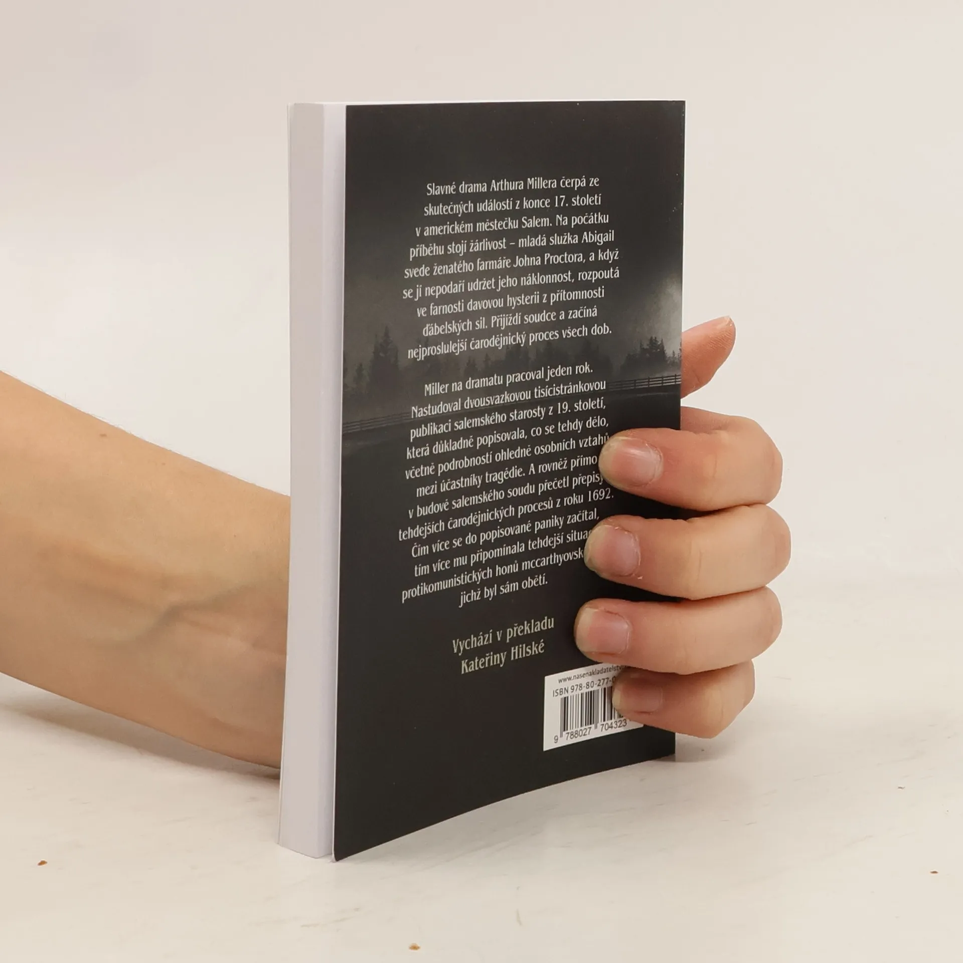 Slavné drama klasického amerického autora čerpá ze skutečných událostí z konce 17. století v americkém městečku Salem kdesi v Massachusetts, ale odkazuje k Millerově současnosti a k protikomunistickým honům na čarodějnice mccarthyovské éry, jejichž obětí byl i sám autor. Na počátku příběhu stojí žárlivost – mladá služka Abigail svede ženatého farmáře Johna Proctora, a když se jí nepodaří udržet jeho náklonnost, rozpoutá ve farnosti davovou hysterii z přítomnosti ďábelských sil. Přijíždí vyšetřující soudce a začne nejproslulejší čarodějnický proces všech dob, počty křivě obviněných žen jdou do desítek, nakonec dojde i na Proctorovu manželku, jíž se chce Abigail pomstít. Vychází v překladu Kateřiny Hilské.
