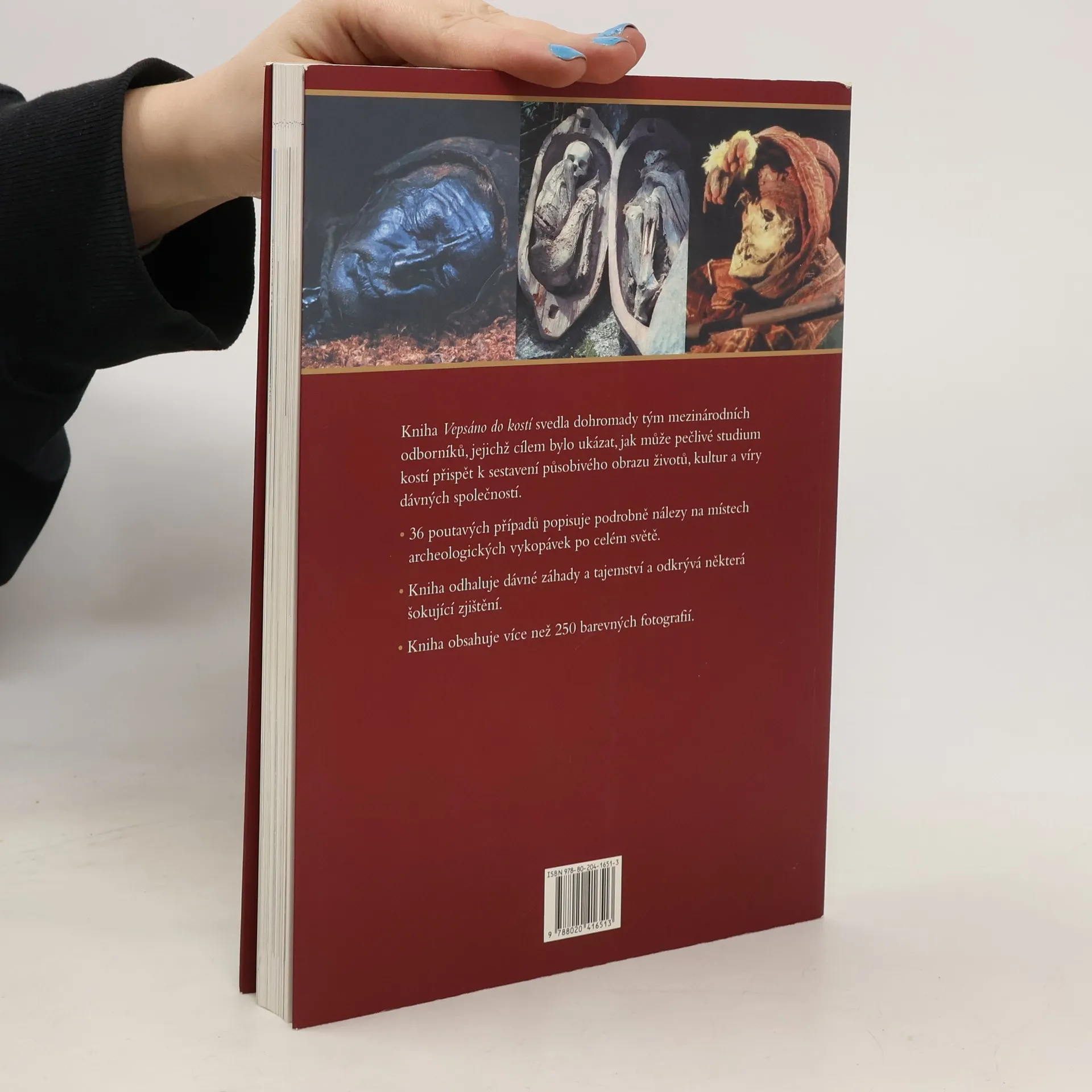 Vepsáno do kostí – Jak lidské ostatky odhalují tajemství mrtvých. Podmanivý obraz životů, kultur a víry starodávných civilizací z celého světa, vyčtený z lidských ostatků. Lidské ostatky nám přinášejí spoustu informací o tom, jak žili a umírali naši předkové. V knize Vepsáno do kostí jsou shromážděny a analyzovány některé z významných nálezů posledních let – objevy z Údolí zlatých mumií, zvláštní mumie z Chinchorra v severním Chile, sněžný muž Ötzi, nejstarší trpaslík na světě, bezhlavý muž či obří vlci na mezolitickém hřbitově v sibiřském Irkutsku. Seznámíme se s moderními vědeckými postupy, jež odborníci používají, aby z nalezených kostí zjistili co nejvíce informací, a dozvíme se, jak se získané informace využívají k vytvoření obrazu jednotlivých kultur. Tým mezinárodních odborníků soustředil v knize 36 podrobně zpracovaných případů, doprovázených více než 250 barevnými fotografiemi, a podal tak podmanivý obraz životů kultur a víry starodávných civilizací z celého světa.