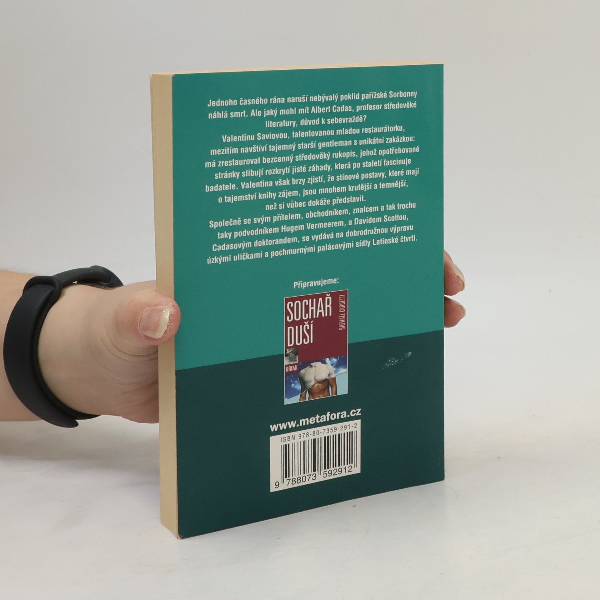 Jednoho časného rána naruší nebývalý poklid pařížské Sorbonny náhlá smrt. Ale jaký mohl mít Albert Cadas, profesor středověké literatury, důvod k sebevraždě? Valentine Saviovou, talentovanou mladou restaurátorku, mezitím navštíví tajemný starší gentleman s unikátní zakázkou: má zrestaurovat bezcenný středověký rukopis, jehož opotřebované stránky slibují rozkrytí jisté záhady, která po staletí fascinuje badatele i spisovatele. Valentine však brzy zjistí, že stínové postavy, které mají o tajemství knihy zájem, jsou mnohem krutější a temnější, než si vůbec dokáže představit. Společně se svým přítelem, aristokratem, znalcem a tak trochu taky podvodníkem Hugem Vermeerem, a Davidem Scottou, Cadasovým doktorandem, se Valentine vydává na dobrodružnou výpravu úzkými uličkami a pochmurnými palácovými sídly Latinské čtvrti. 1. vydání.