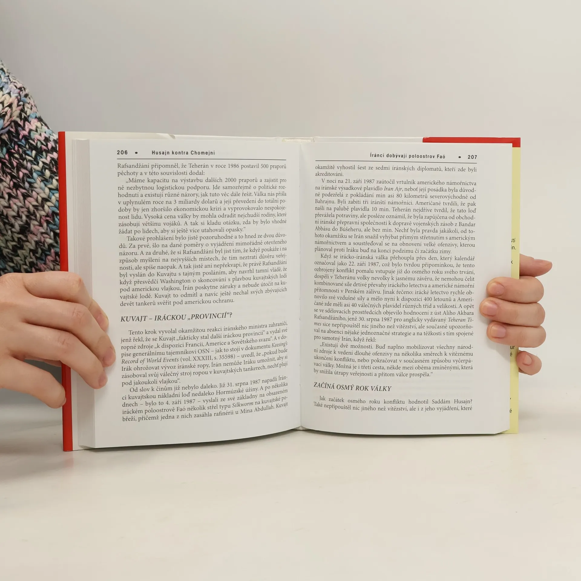 Český žurnalista interpretuje průběh irácko-íránské války od napadení Íránu roku 1980 po ukončení konfliktu v roce 1988. Následkem íránské islámské revoluce se Husajn z obavy o rozšíření jejích idejí mezi iráckými šíity rozhodl napadnout celkově oslabený Írán. Rekapitulace od napadení Íránu přes jednotlivé fáze bouřlivě se vyvíjejícího konfliktu včetně vojenských specifik, jakými byly sebevražedné útoky či nasazení chemických zbraní, až po přijetí ustanovení o zastavení palby. Brož se věnuje rovněž roli velmocí a Československa i zájmům zbrojního komplexu na irácko-íránském konfliktu.