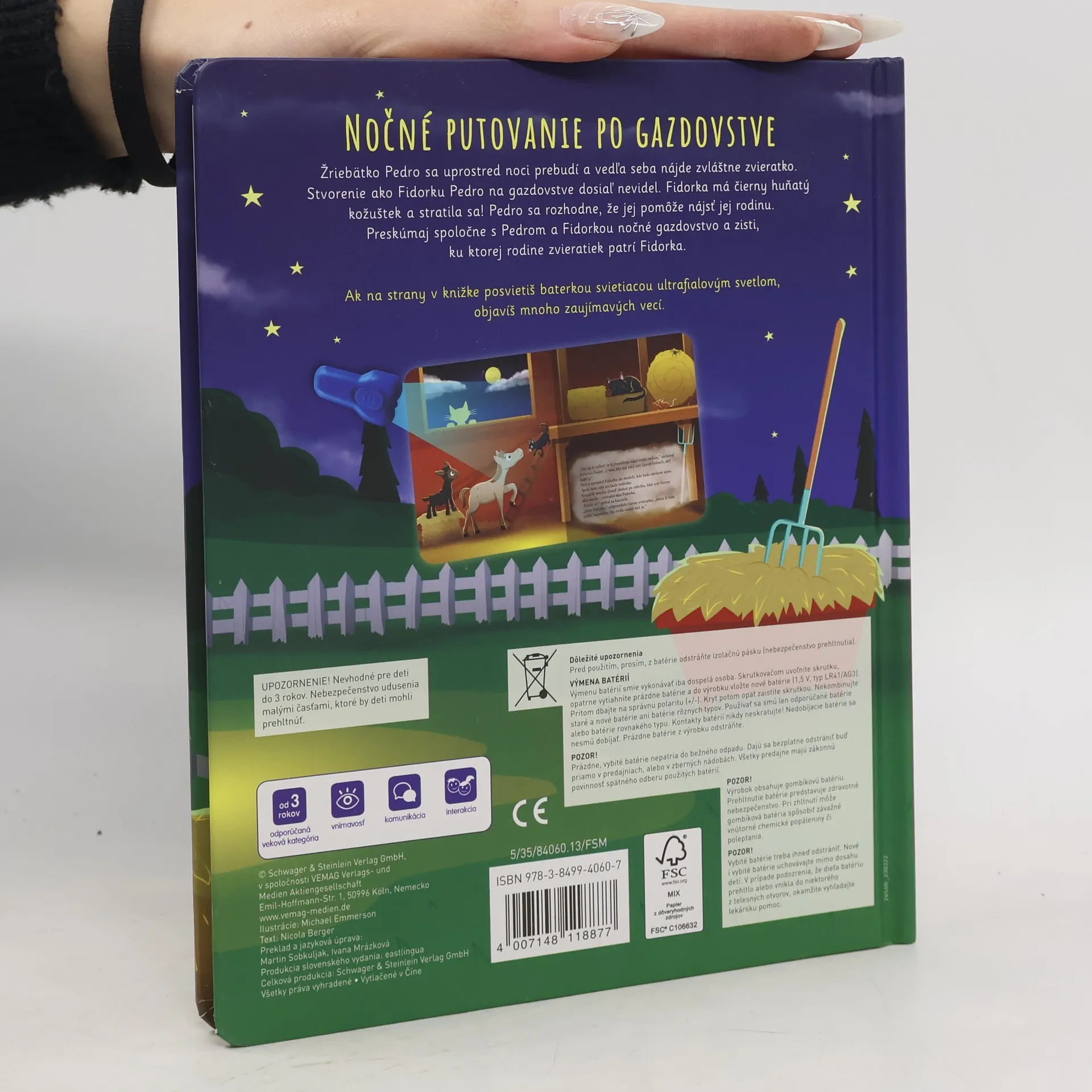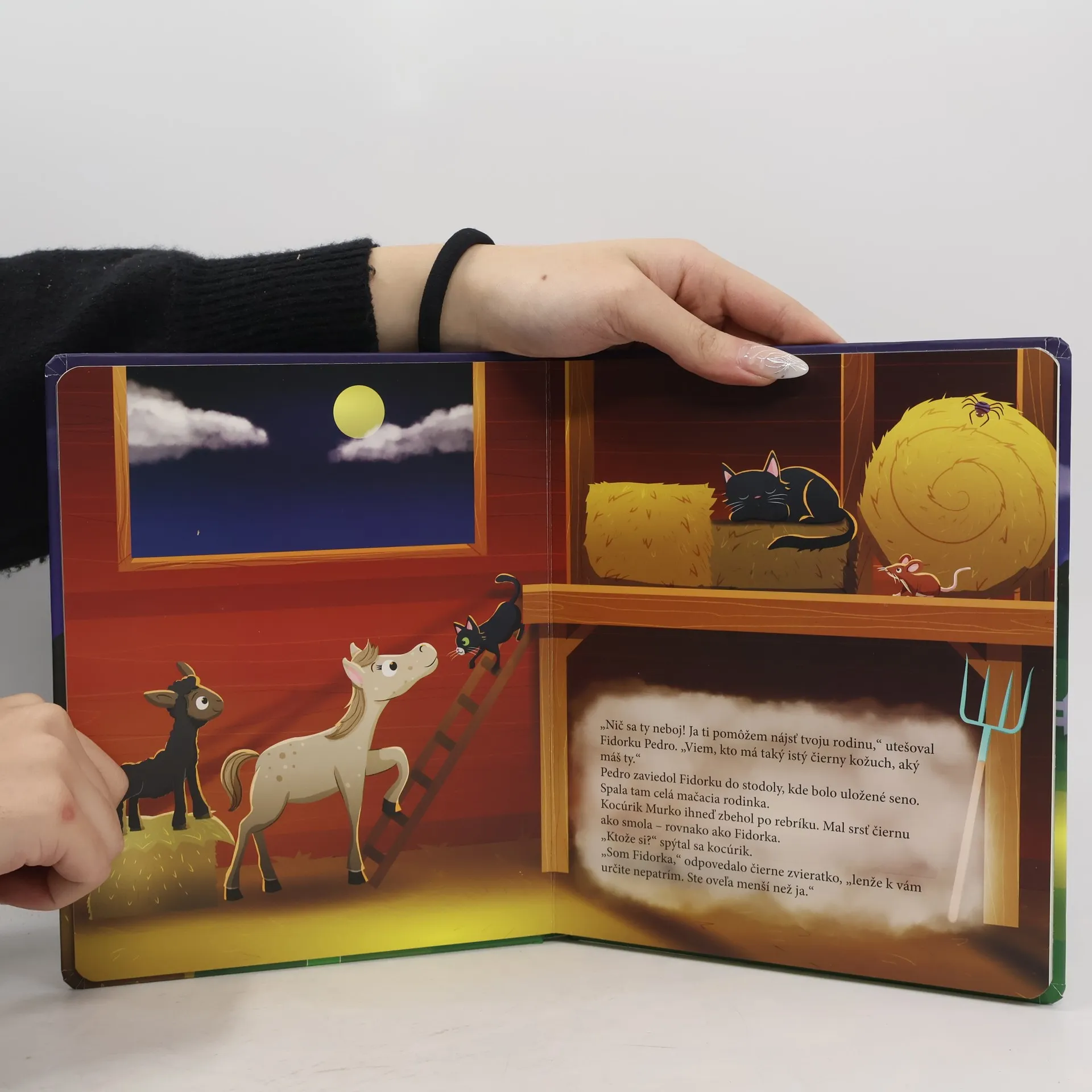 Hříbátko Ferda se uprostřed noci probudí a vedle sebe najde zvláštní zvířátko. Stvoření jako Fidorku Ferda na statku dosud neviděl. Fidorka má černý huňatý kožíšek a ztratila se! Ferda se rozhodne, že jí pomůže najít její rodinu. Prozkoumej společně s Ferdou a Fidorkou noční statek a zjisti, ke které zvířecí rodince Fidorka patří. Když na stránky v knížce posvítíš baterkou svítící ultrafialovým světlem, objevíš spoustu zajímavých věcí.