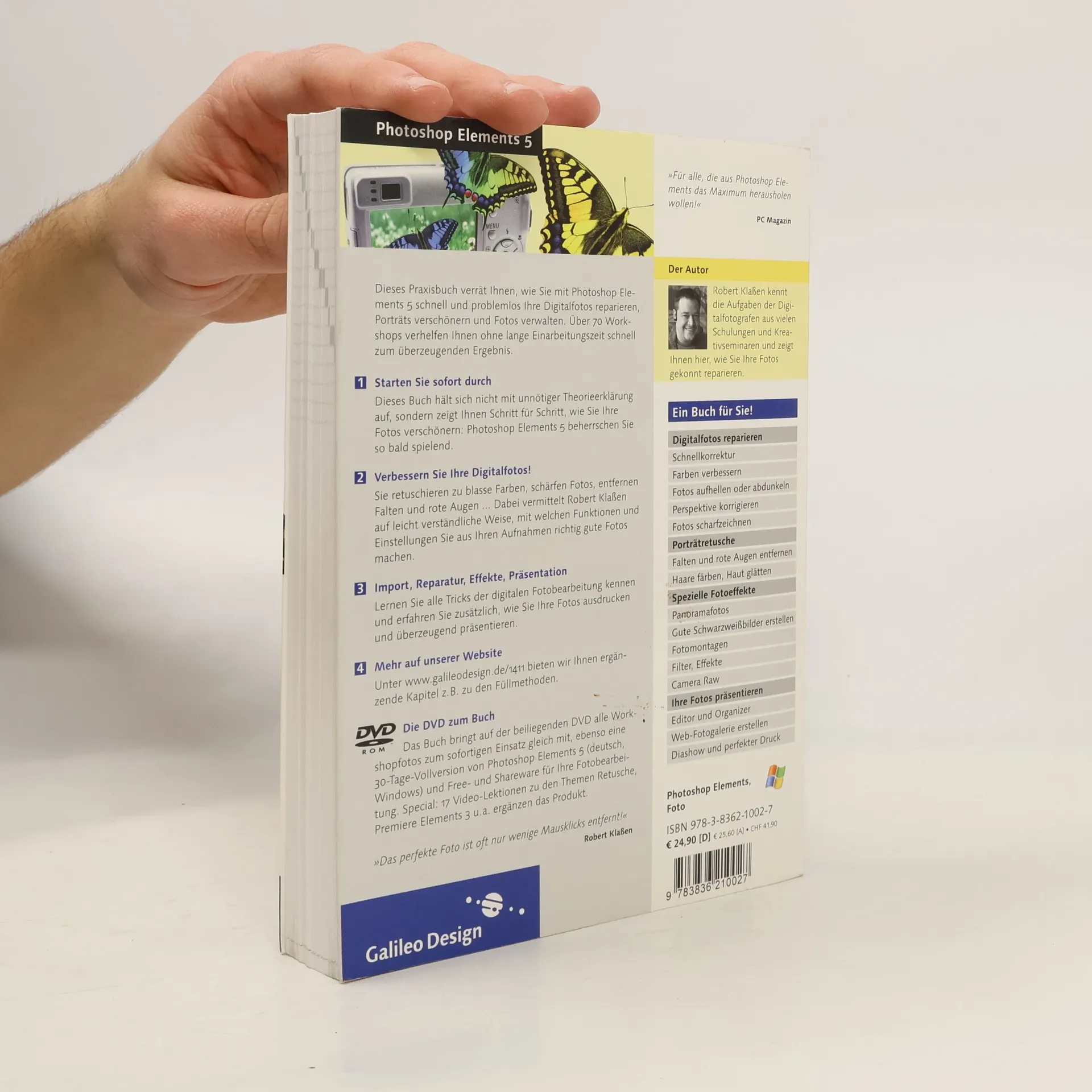 Dieses Buch wendet sich an Einsteiger in die Software Adobe Photoshop Elements 5. Es hält sich nicht mit unnötigen Technikerklärungen auf, sondern zeigt Ihnen Schritt für Schritt, wie Sie Ihre Digitalfotos verschönern: Sie korrigieren die zu blassen Farben, schärfen Ihre Fotos, entfernen Falten und rote Augen. Dabei nimmt der Autor Sie an die Hand und zeigt Ihnen, welche Einstellungen Sie vornehmen sollten und welche Funktionen Ihnen weiterhelfen. Weitere Themen sind: Porträtretusche, Fotos freistellen, Perspektiven korrigieren, falsch belichtete Fotos reparieren, Spezialeffekte, Schwarzweißfotos erstellen uvm.