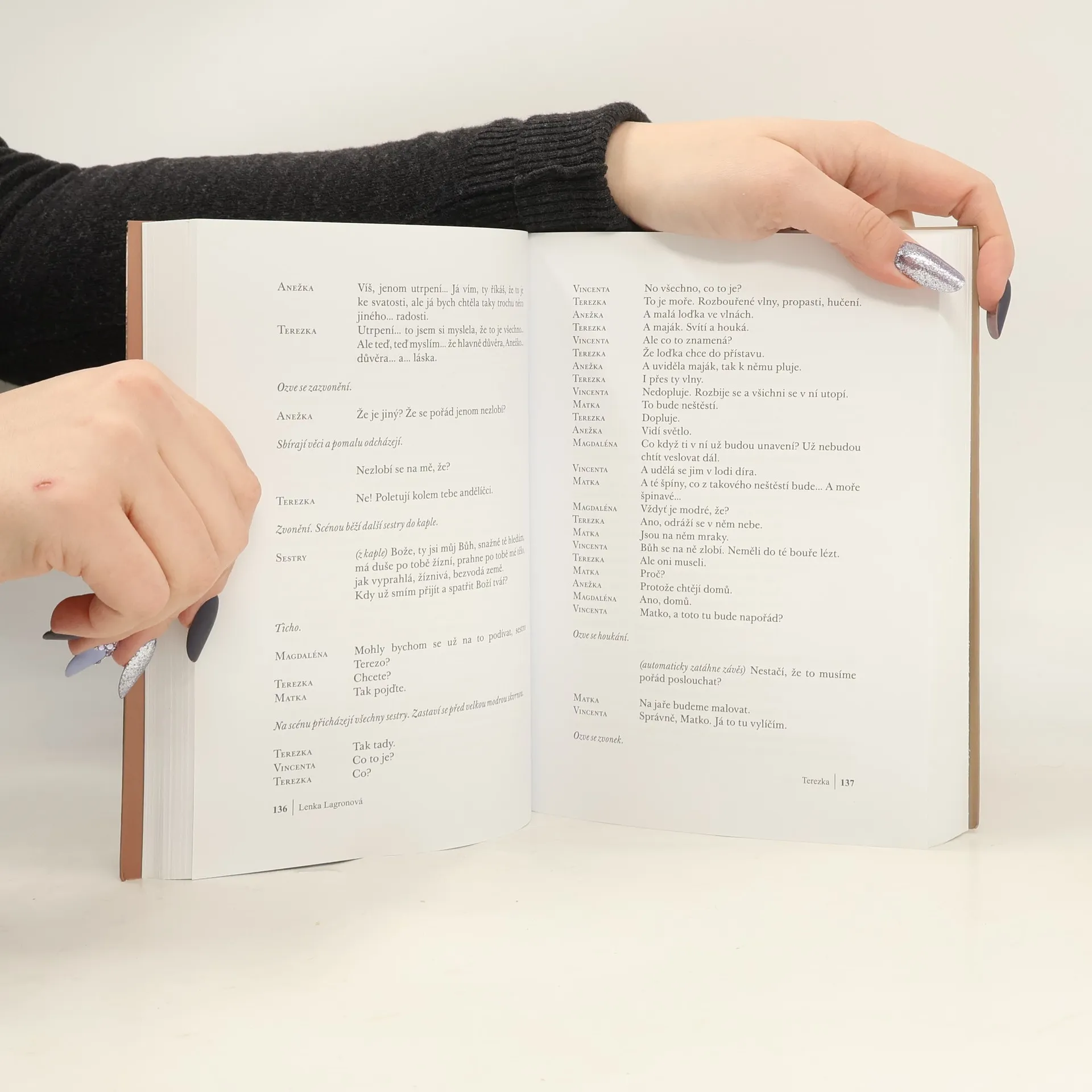 Svazek zahrnuje jedenáct autorčiných her, které napsala v rozmezí let 1993-2008. Její hry mají silné spirituální vyznění a Lagronová klade nezvykle silný důraz na slovo, své příběhy koncipuje jako silné duchovní prožitky a do her vkládá křesťanské poselství. Téma bolesti, osamělosti, touhy po naplnění a zároveň jistoty života spojeného s vyšším bytím je přítomno vždy. Obsahuje: Markýza -- Tanečník -- Antilopa -- Terezka -- Království -- Nikdy -- Miriam -- Johanka -- Etty Hillesum -- Pláč -- Křídlo. K vydání připravila, doslov, ediční poznámku a medailon autorky napsala Lenka Jungmannová.