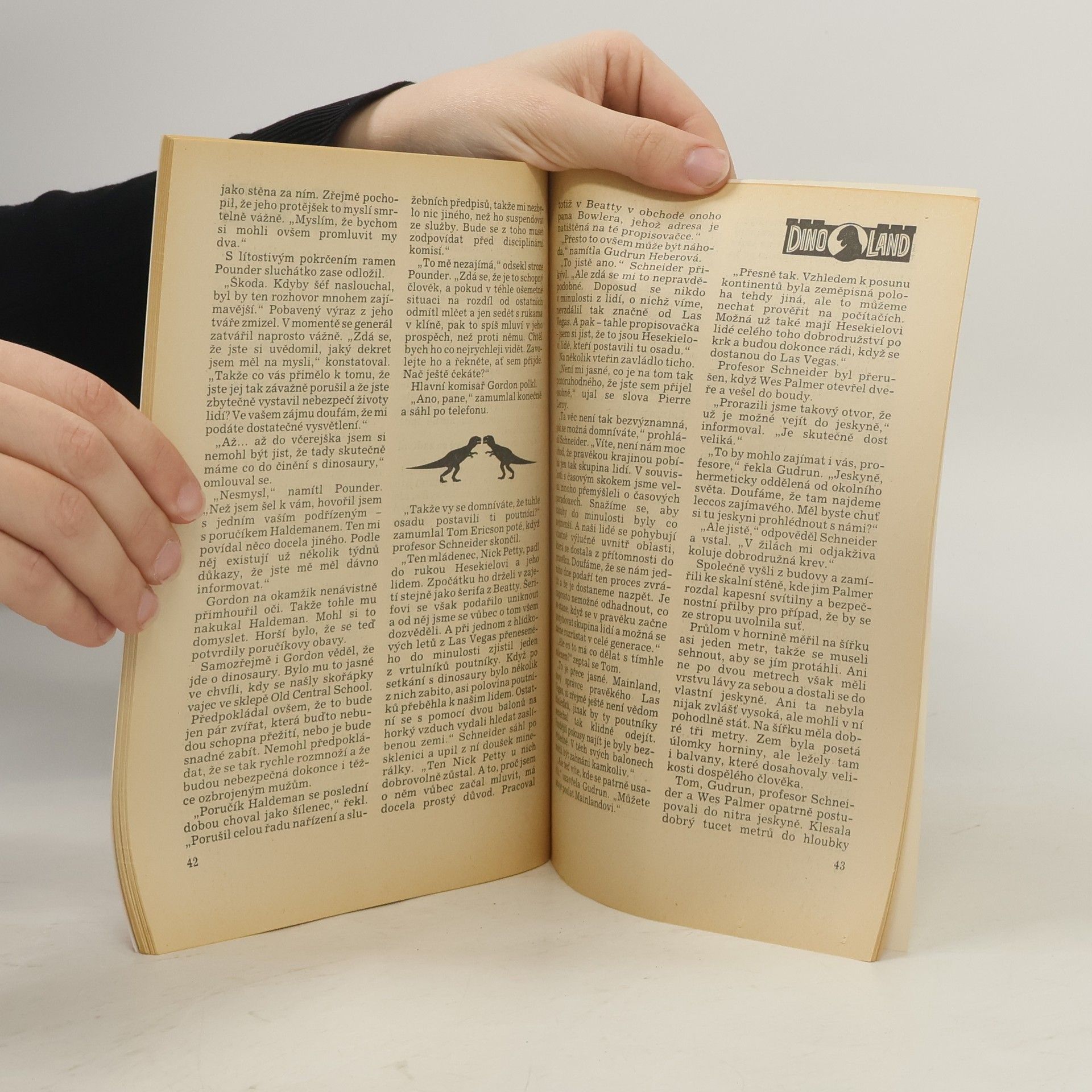 Deník Nicka Pettyho, 12. června: Byli jsme obklíčeni. Celkem to byly téměř dva tucty dinosaurů sotva větších než dospělý člověk. Měli štíhlá těla, pštrosí nohy, úzká ramena a hlavu, která seděla na krku dlouhém téměř jako paže. Ruce i nohy byly zakončeny tříčlánkovými drápy. Přiblížili se k nám nepozorovaně zpoza chatrčí a hradeb primitivní osady a jejich kruh se už sevřel. Museli postupovat velmi šikovně, že jsme si jich nevšimli dřív ani ze vzduchu, když jsme nad osadou prolétávali. Senzací bylo už to, že zde, v údolní kotlině stovky mil od oblastí časových skoků, jsou stopy lidské civilizace. Zřejmě se před nějakou dobou vydalo pár lidí – zrovna jako my – na průzkum nedotčené pravěké přírody. Z nějakého důvodu se tady usadili, založili osadu a na ochranu proti útokům dinosaurů ji obehnali valy připomínajícími opevnění. Nic jim to však nebylo platné. -- zdroj: www.legie.info --