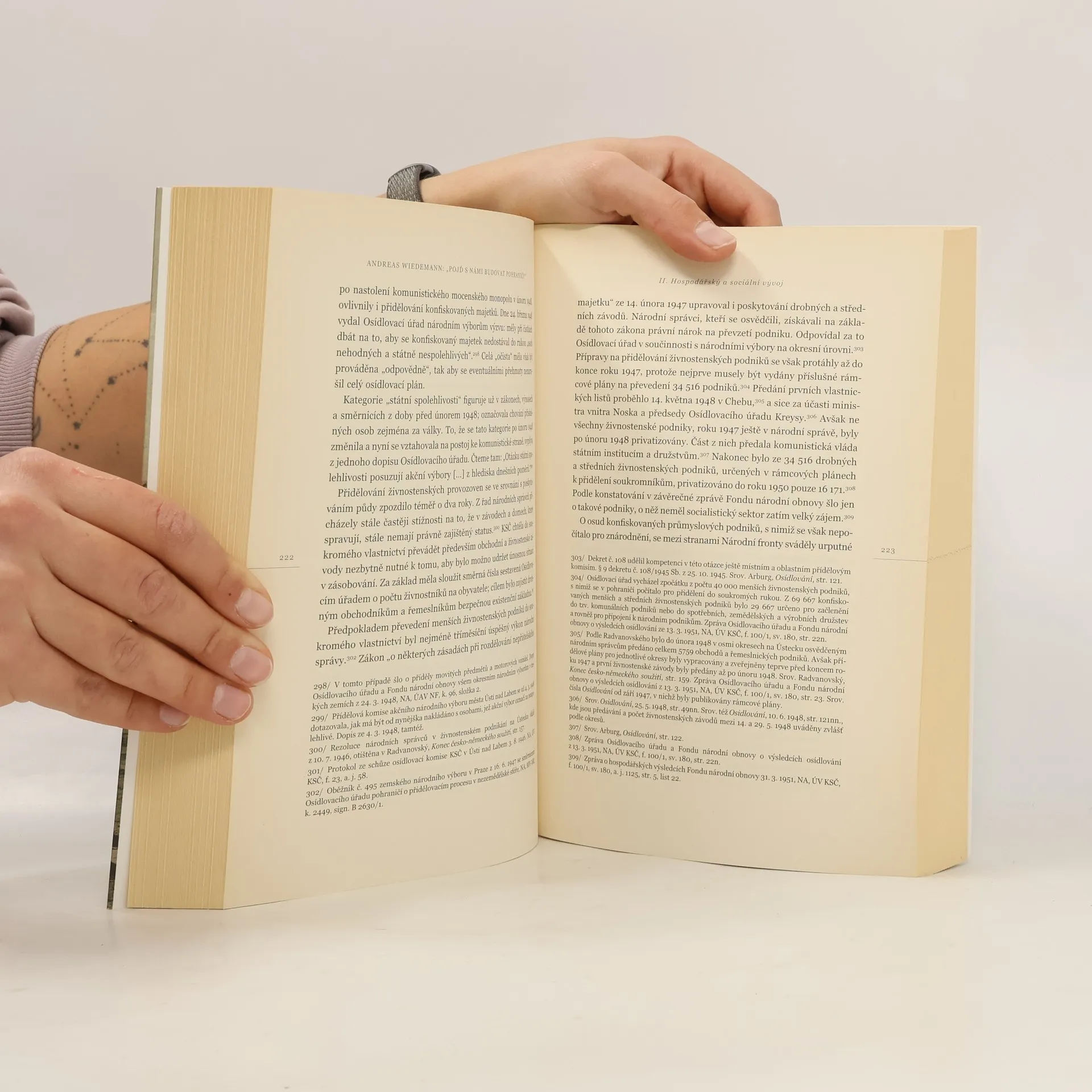 Důkladná práce německého historika Andrease Wiedemanna mapuje druhou a méně známou část procesu, při kterém došlo k největším přesunům obyvatelstva v českých zemích. Celkem se vyhnání a znovuosídlování týkalo pěti milionů lidí. První české přistěhovalce začaly přicházet do pohraničí brzy po válce, což vedlo k napětí a tlaku na vypuzení Němců. Od konce léta 1945 se osídlování organizovalo státem prostřednictvím ministerstev a institucí, včetně Osídlovacího úřadu. Zhruba 1,3 milionu Čechů z vnitrozemí a 200 tisíc Čechů a Slováků z jiných evropských zemí přišlo do pohraničních oblastí, avšak osídlování probíhalo obtížně a nové obyvatele přitahovaly spíše snadněji obdělávatelné oblasti. Počet obyvatelstva se snížil o třetinu, což vedlo k dramatickým změnám a nedostatku pracovních sil. Autor upozorňuje na negativní jevy, jako byly ozbrojené bandy a partyzáni, a analyzuje motivy migrantů, jejich vztahy a konflikty s původními obyvateli. Zkoumá také obtížné vytváření společné identity a vliv nacionální propagandy. Vysvětluje, proč KSČ vyhrála v pohraničních okresech s větší převahou a jak osídlování přispělo k uchvácení moci komunisty a kolektivizaci zemědělství. Wiedemannova práce přináší množství podrobných informací a syntetický pohled na důsledky znovuosídlování, které jsou patrné dodnes.
