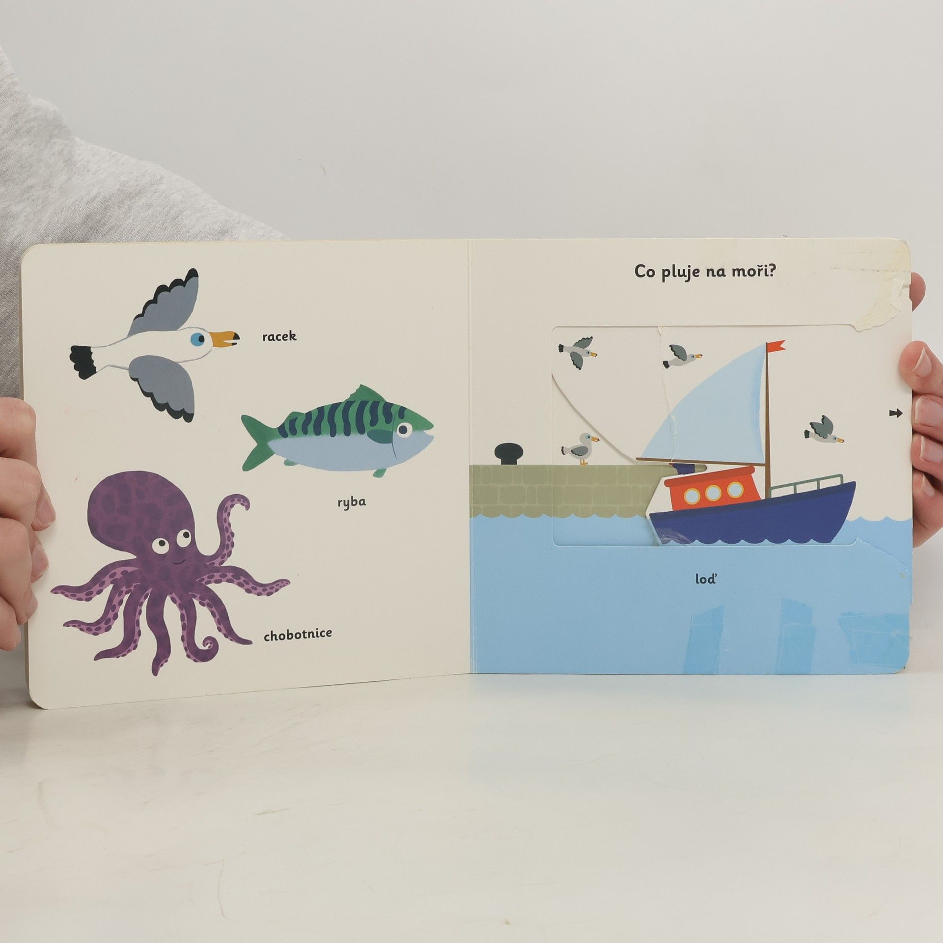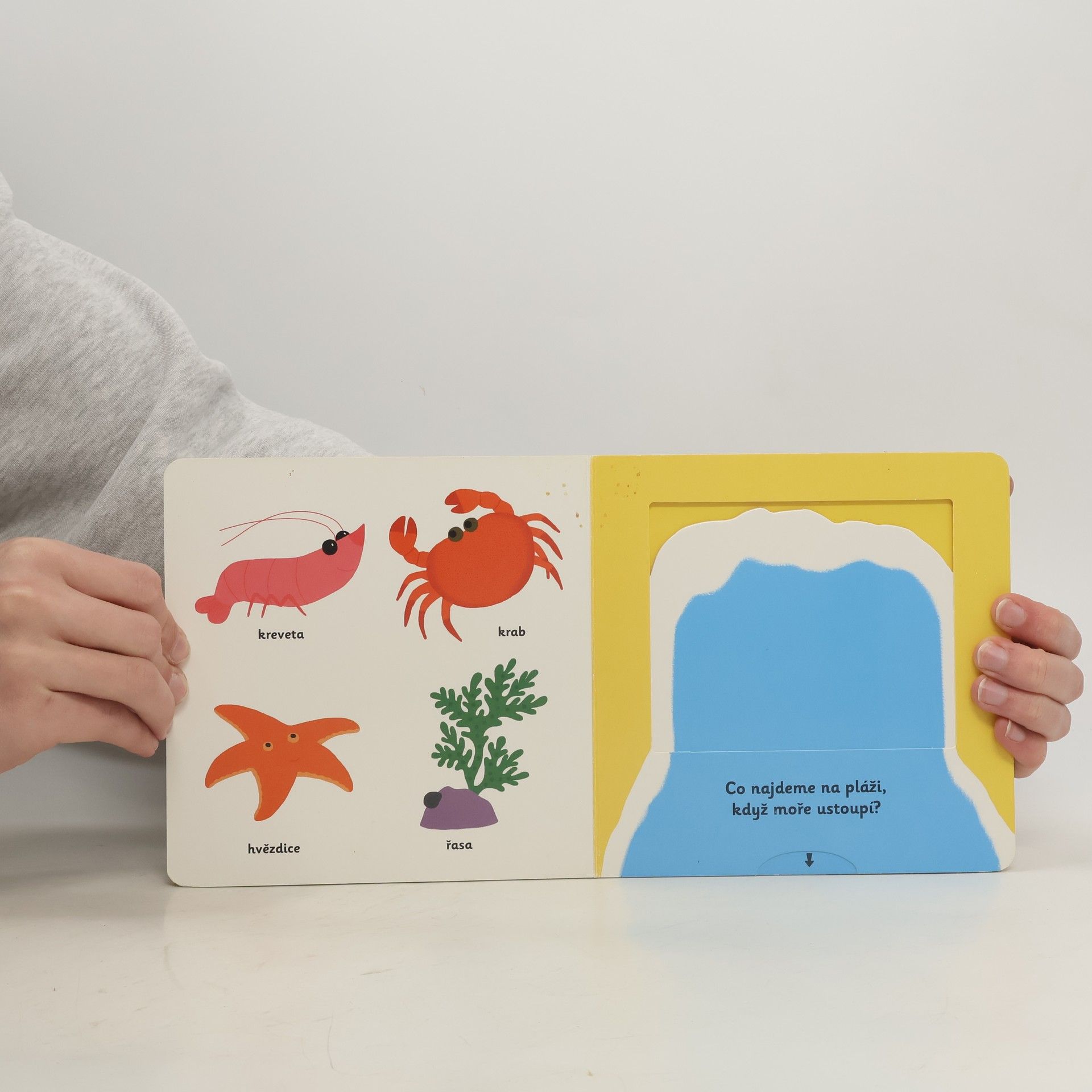 Pojďme na pláž a taky do moře mezi vlny! Co všechno si vezmeš s sebou? Plavky, kruh a taky lopatičku na písek! Knížka plná pestrých ilustrací je vhodná pro nejmenší děti, které si díky ní procvičí jemnou mototriku – obsahuje totiž velké množství nejrůznějších pohyblivých částí a okének, které obrázky oživují. Knížka s prvky Montessori.