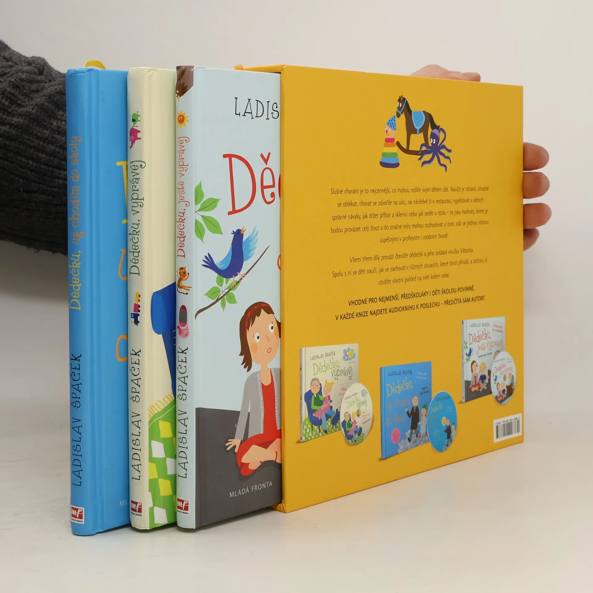 Dědečku, vyprávěj Dědečku, ještě vyprávěj Dědečku, už chodím do školy Slušné chování je to nejcennější, co mohou rodiče svým dětem dát. Naučit je zdravit, vhodně se oblékat, chovat se zdvořile na ulici, na návštěvě či v restauraci, vypěstovat v dětech správné návyky, jak držet příbor a sklenici nebo jak sedět u stolu – to jsou hodnoty, které je budou provázet celý život a do značné míry mohou rozhodovat o tom, zda se jednou stanou úspěšnými v profesním i osobním životě. Všemi třemi díly Špačkovy etikety a etiky pro děti provází čtenáře dědeček a jeho zvídavá vnučka Viktorka. Spolu s ní se děti naučí, jak se zachovat v různých situacích, které život přináší, a začnou si utvářet pohled na svět kolem sebe. Vhodné pro nejmenší, předškoláky i děti školou povinné.
