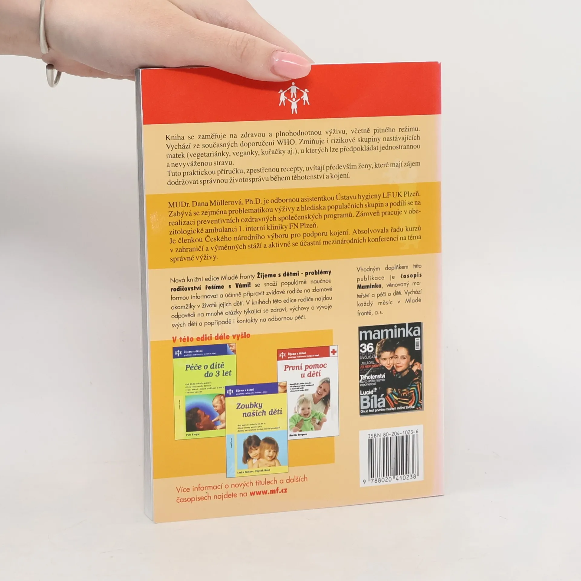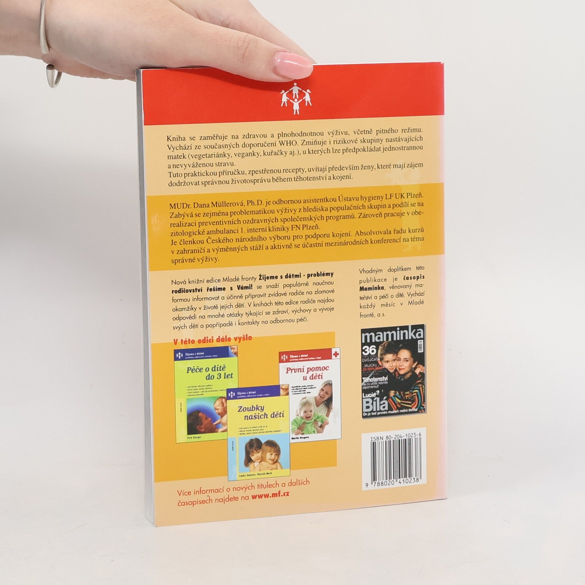 Publikácia, ktorá zhrňuje najnovšie poznatky z oblasti výživy tehotných a dojčiacich žien. Mudr.Dana Mullerová, PhD. je odbornou asistentkou Ústavu hygieny LF UK Plzeň. Je členkou národného výboru pre podporu dojčenia. Absolvovala rad kurzov v zahraničí a výmenných stáží a aktívne sa zúčastňuje medzinárodných konferencií na tému správnej výživy.Túto praktickú príričku spestrujú recepty.