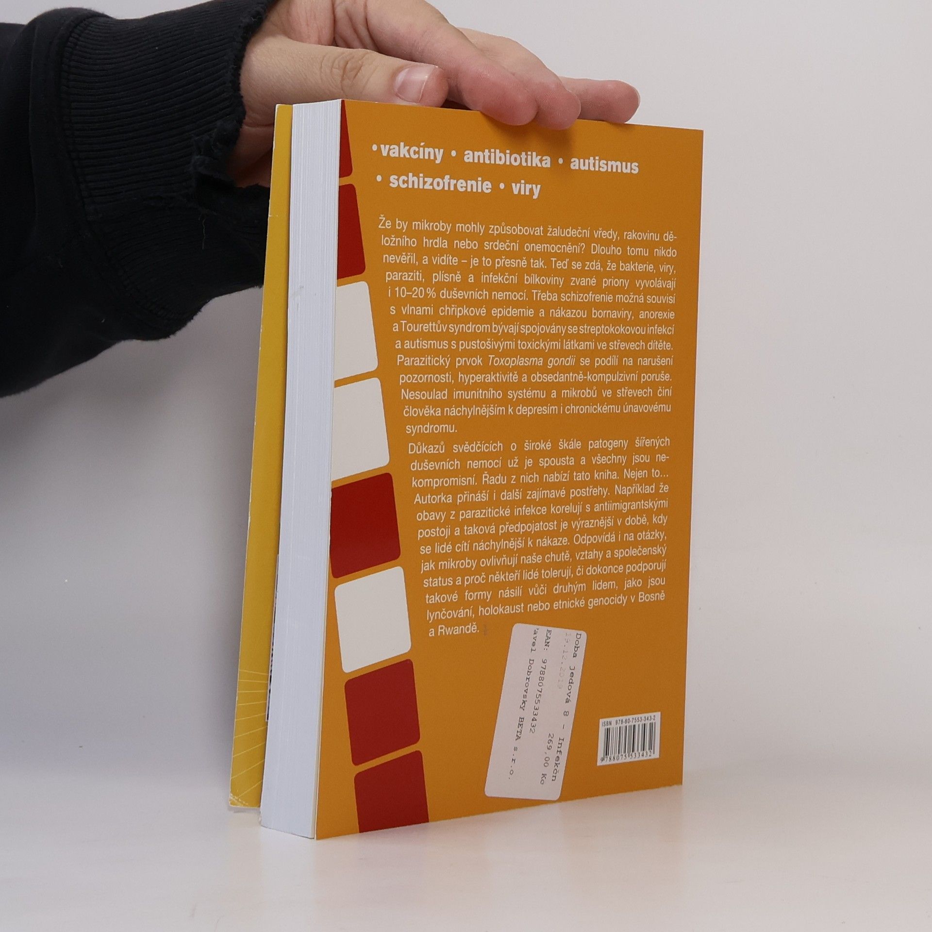 Že by mikroby mohly způsobovat žaludeční vředy, rakovinu děložního hrdla nebo srdeční onemocnění? Dlouho tomu nikdo nevěřil, a vidíte – je to přesně tak. Teď se zdá, že bakterie, viry, paraziti, plísně a infekční bílkoviny zvané priony vyvolávají i 10–20 % duševních nemocí. Třeba schizofrenie možná souvisí s vlnami chřipkové epidemie a nákazou bornaviry, anorexie a Tourettův syndrom bývají spojovány se streptokokovou infekcí a autismus s pustošivými toxickými látkami ve střevech dítěte. Parazitický prvok Toxoplasma gondii se podílí na narušení pozornosti, hyperaktivitě a obsedantně-kompulzivní poruše. Nesoulad imunitního systému a mikrobů ve střevech činí člověka náchylnějším k depresím i chronickému únavovému syndromu. Důkazů svědčících o široké škále patogeny šířených duševních nemocí už je spousta a všechny jsou nekompromisní. Řadu z nich nabízí tato kniha. Nejen to… Autorka přináší i další zajímavé postřehy. Například že obavy z parazitické infekce korelují s antiimigrantskými postoji a taková předpojatost je výraznější v době, kdy se lidé cítí náchylnější k nákaze. Odpovídá i na otázky, jak mikroby ovlivňují naše chutě, vztahy a společenský status a proč někteří lidé tolerují, či dokonce podporují takové formy násilí vůči druhým lidem, jako jsou lynčování, holokaust nebo etnické genocidy v Bosně a Rwandě.