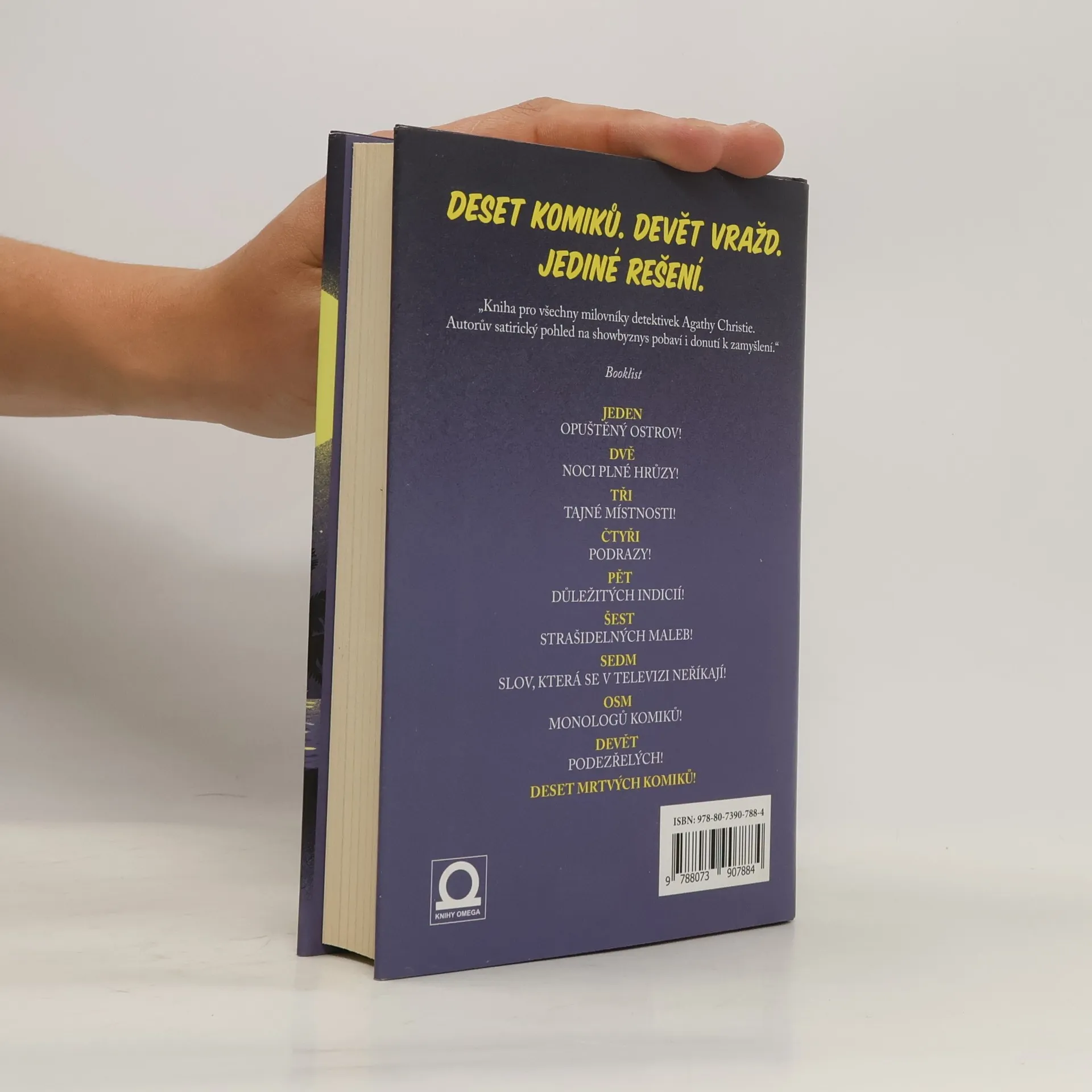 Brilantní Van Lenteho debut je poctou Zlatému věku mystery a zároveň břitkou satirou současného šoubyznysu. Příběh začíná pozváním devíti uznávaných komiků k legendárnímu hollywoodskému producentovi zábavních pořadů Dustinu Walkerovi na jeho soukromý ostrov. Ve skupince je bývalý moderátor populární late-night šou, stand up komik, komik z ulice, jenž pohádkově zbohatl, nebo ikona zábavy z Las Vegas. Všech devět dorazí lodí na ostrov a zjistí, že všechny domy jsou zcela opuštěné. Nefungují tu mobily ani wifi připojení a brzy začne jeden po druhém umírat. Kniha vzdává hold velikánům žánru jako Agatha Christie a jejím Deseti malým černouškům a zároveň originální zábavou díky vtipným a komickým dialogům postav, neboť každá z nich se záhadu snaží vyřešit stylem svého oblíbeného detektiva.