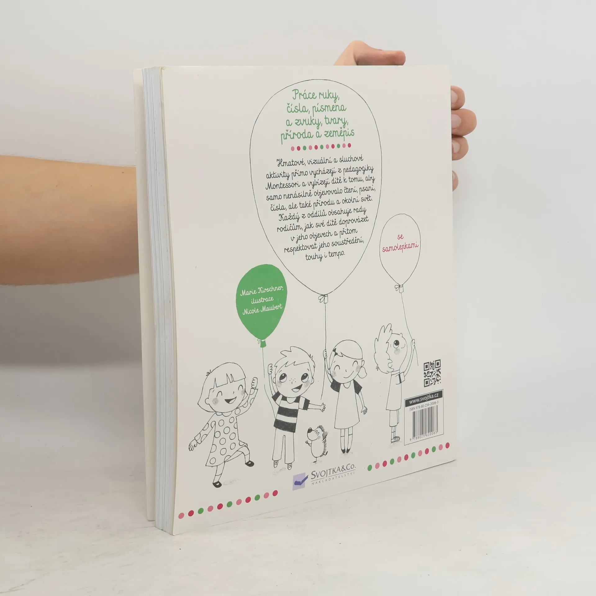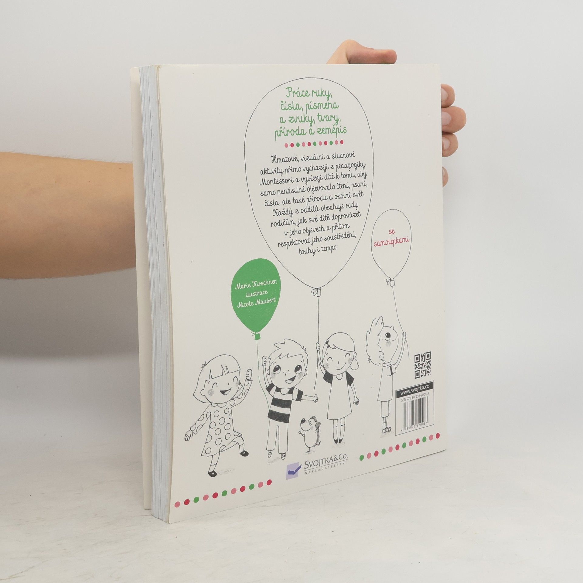 Knížka je plná nejrůznějších činností pro děti od 3 do 6 let. V podobě pracovního sešitu překládá rozmanité aktivity z metody "Montessori", které podporují děti v tom, aby poznávaly a porozuměly okolnímu světu. Důraz je kladen na práci s přírodními materiály, také proto jsou stránky většinou černobílé. Jednotlivé činnosti jsou sestaveny tak, aby si dítě postupně osvojilo základy psaní, počítání a připravilo se ke čtení. V knížce se může malovat, lepit i stříhat, součástí knihy jsou též samolepky. Nechybí ani poznávání přírody a světa kolem nás. Doprovodné texty určené rodičům vysvětlují, jak s jednotlivými částmi knihy pracovat. Tak honem do toho. Svět kolem vás už čeká na objevení! Knížka s prvky Montessori.