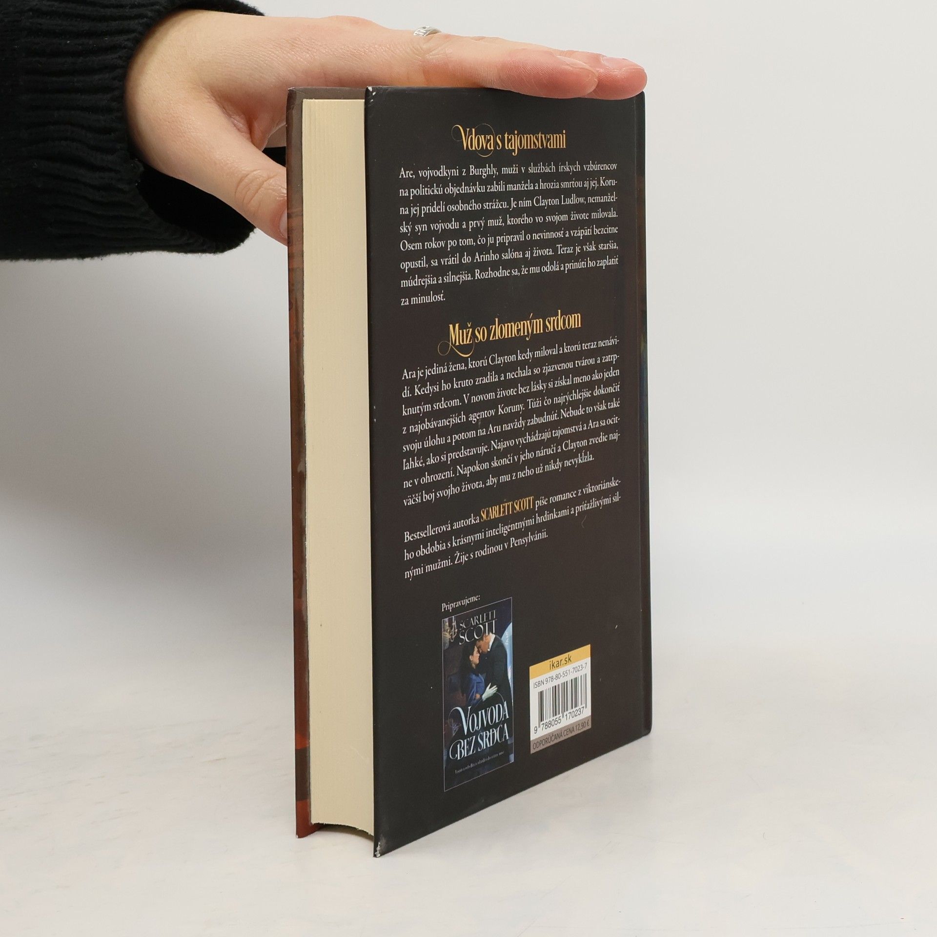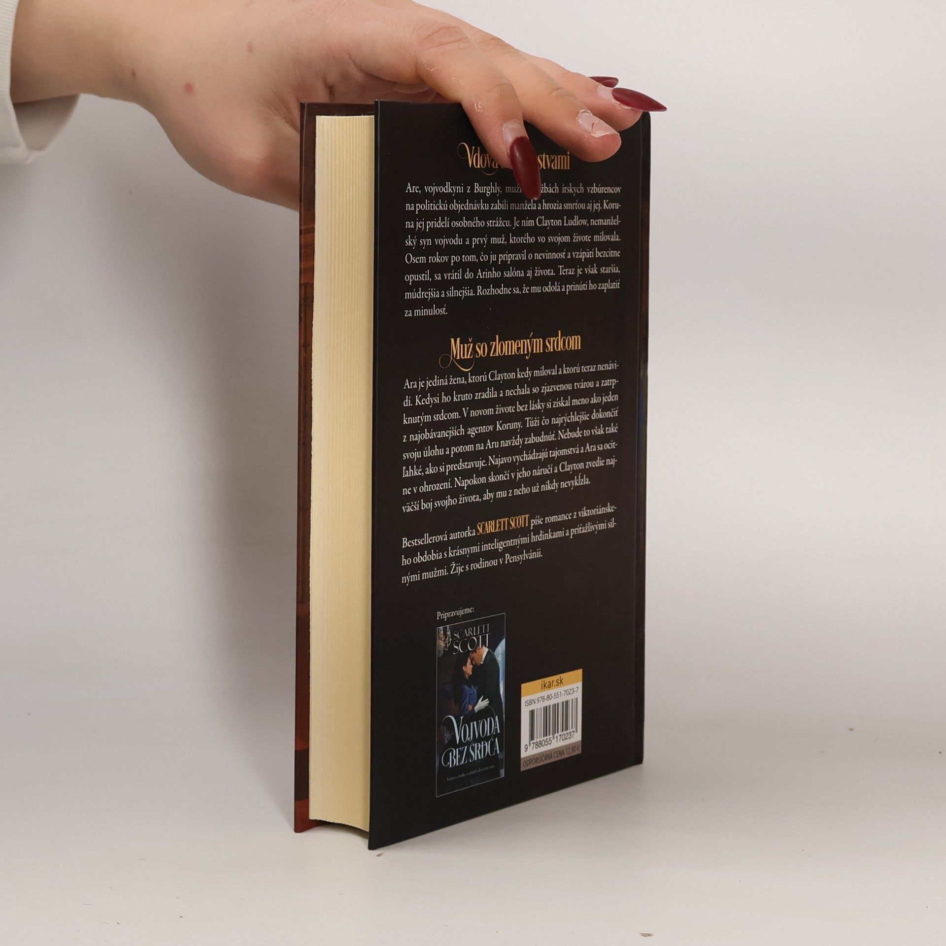 Vdova s tajomstvami Are, vojvodkyni z Burghly, muži v službách írskych vzbúrencov na politickú objednávku zabili manžela a hrozia smrťou aj jej. Koruna jej pridelí osobného strážcu. Je ním Clayton Ludlow, nemanželský syn vojvodu a prvý muž, ktorého vo svojom živote milovala. Osem rokov po tom, čo ju pripravil o nevinnosť a vzápätí bezcitne opustil,sa vrátil do Arinho salóna aj života. Teraz je však staršia, múdrejšia a silnejšia. Rozhodne sa, že mu odolá a prinúti ho zaplatiť za minulosť. Muž so zlomeným srdcom Ara je jediná žena, ktorú Clayton kedy miloval, a ktorú teraz nenávidí. Kedysi ho kruto zradila a nechala so zjazvenou tvárou a zatrpknutým srdcom. V novom živote bez lásky si získal meno ako jeden z najobávanejších agentov Koruny. Túži čo najrýchlejšie dokončiť svoju úlohu a potom na Aru navždy zabudnúť. Nebude to však také ľahké, ako si predstavuje. Najavo vychádzajú tajomstvá a Ara sa ocitne v ohrození. Napokon sa znovu ocitne v jeho náručí, kam patrí, a Clayton zvedie najväčší boj svojho života, aby mu z neho už nikdy nevyklzla.