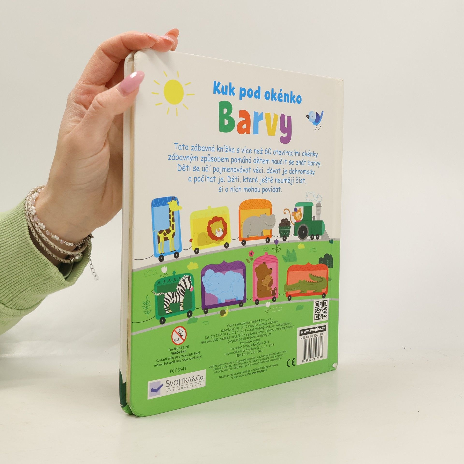Kartonové listy s odklápěcími okénky v pevné vazbě. Leporelo pro nejmenší s otevíracími okénky. Otevřete okénka a naučte vaše dítě základní barvy, počítat věci, dávat je dohromady, počítat do 5 a mnoho dalšího. Jaké jsou základní barvy? Podívej se pod okénko! Odklop okénko a podívej se, kdo se veze v růžovém vagonu barevného vláčku! Podívej se za stromy, jakou barvu mají zvířátka, která se tam schovávají? Najdi schované hračky v obchodě. Kolik jich je? Tato zábavná interaktivní knížka s více než 60 otevíracími okénky obsahuje ještě spoustu dalších zábavných cvičení, která pomáhají dětem naučit se poznávat barvy, pojmenovávat věci, dávat je dohromady a počítat do 5. Děti, které ještě neumějí číst, si o nich mohou alespoň popovídat.