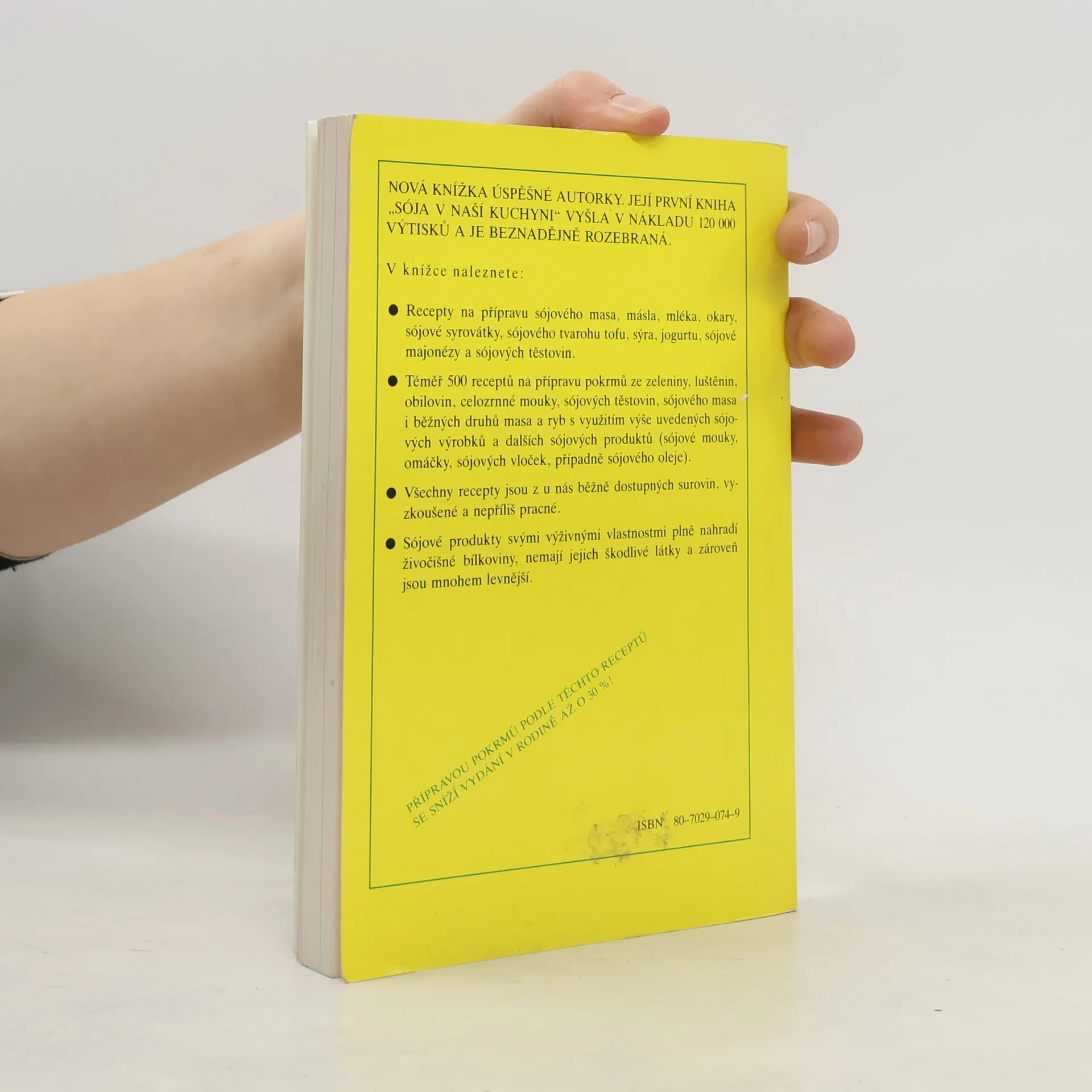 Naleznete zde recepty na přípravu sójového masa, másla, mléka, okary, sójové syrovátky, sójového tvarohu tofu, sýra, jogurtu, sójové majonézy a sójových těstovin... Téměř 500 receptů na přípravu pokrmů ze zeleniny, luštěnin, obilovin, sójového masa i běžných druhů masa a ryb. Všechny recepty jsou z běžně dostupných surovin, vyzkoušené a nepříliš pracné.