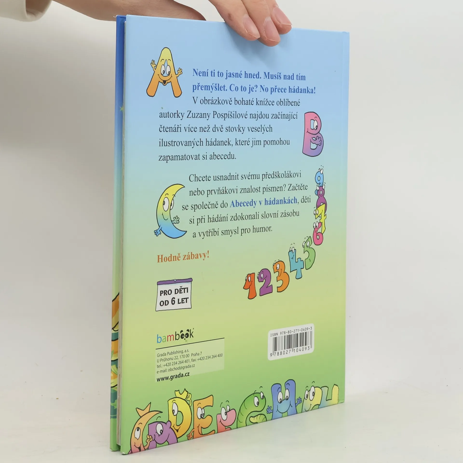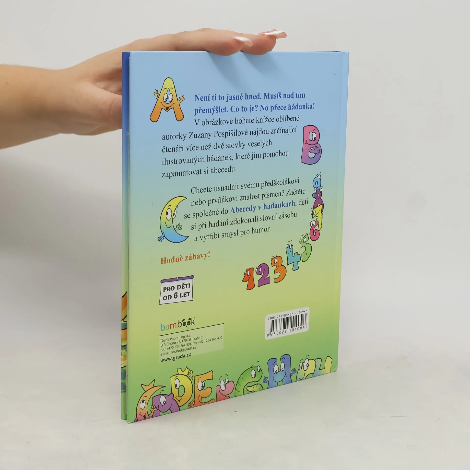 Když je legrace, jde každé učení lehce. Nepřehlédněte proto tuto veselou knížku, která nabízí prvňáčkům veršované hádanky ke každému písmenku abecedy. Řešení napovídají vtipné celostránkové ilustrace. Jestli chcete usnadnit svému předškolákovi nebo prvňákovi znalost písmenek, pusťte se do čtení Abecedy v hádankách, děti si při hádání zdokonalí čtenářské dovednosti, slovní zásobu a vytříbí smysl pro humor.