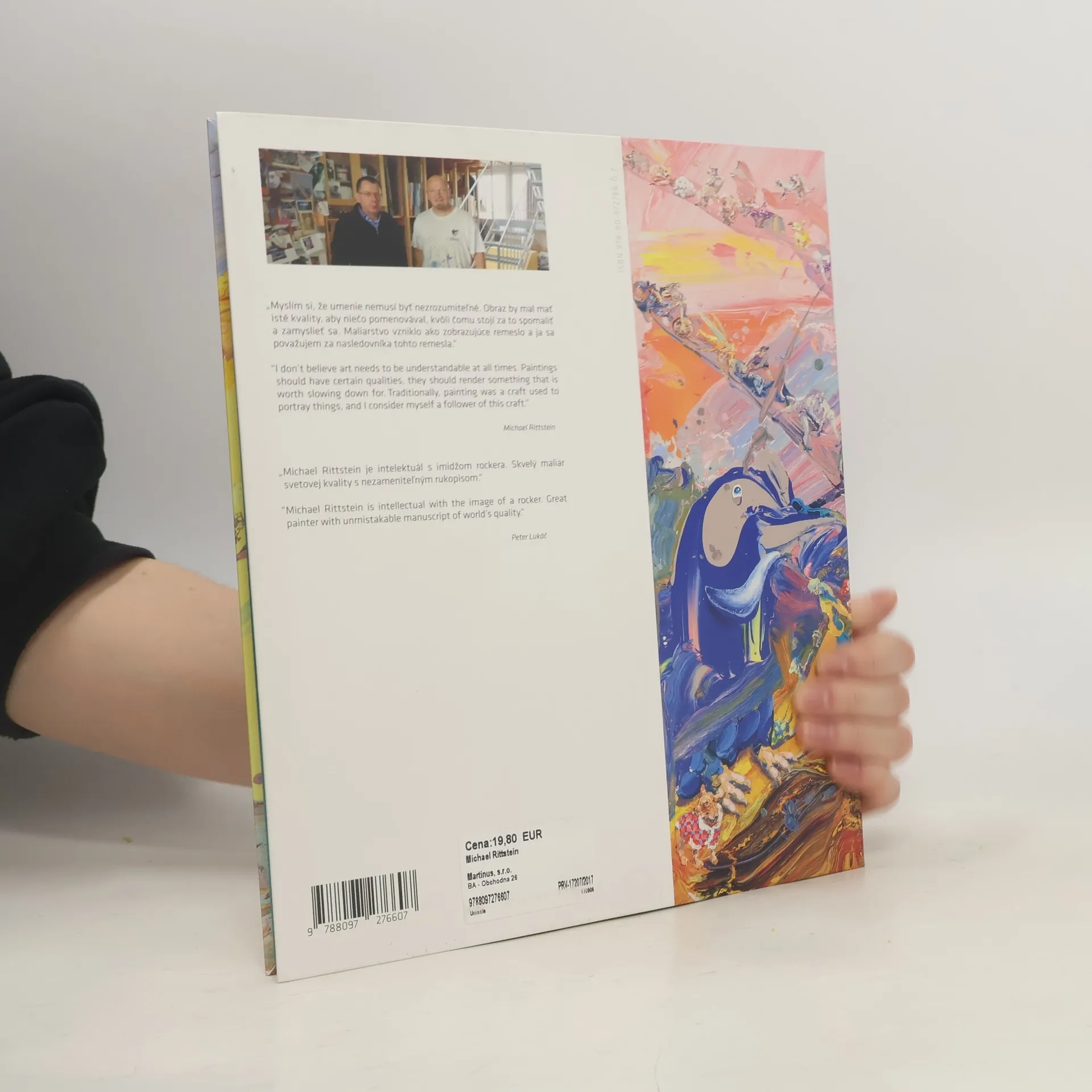 Publikácia Michael Rittstein prináša 80 stranovú plnofarebnú knihu o českom maliarovi, výraznom umelcovi, dlhodobom pedagógovi Michaelovi Rittsteinovi (1949). Michael Rittstein je v obrazových témach pozorovateľom ľudí a sociálnej interakcie medzi živými bytosťami. Ich zobrazovaním sa snaží preniknúť do verbálnej a viac do neverbálnej podstaty situácie medzi nimi. Rittstein kumuluje zo života odpozorované situácie a inscenuje ich na svojich obrazoch. Výsledkom je maľba, ktorá zachytáva ontologické príncípy bytia človeka vo svete: jeho snaženia, výhry, prehry, grotesknosť morálky, ale aj vnútornú integritu jedinca. Publikácia ponúka diela z rokov 1974 – 2017, mnohé z nich vo veľkých detailoch, v plnofarebnej tlači. Obrazy dopĺňa aj Rittsteinov komentár vlastnými slovami k jednotlivým dielam o ich inšpirácii a vzniku. Uverejnené texty sú v slovenskom, anglickom, nemeckom, francúzskom jazyku.