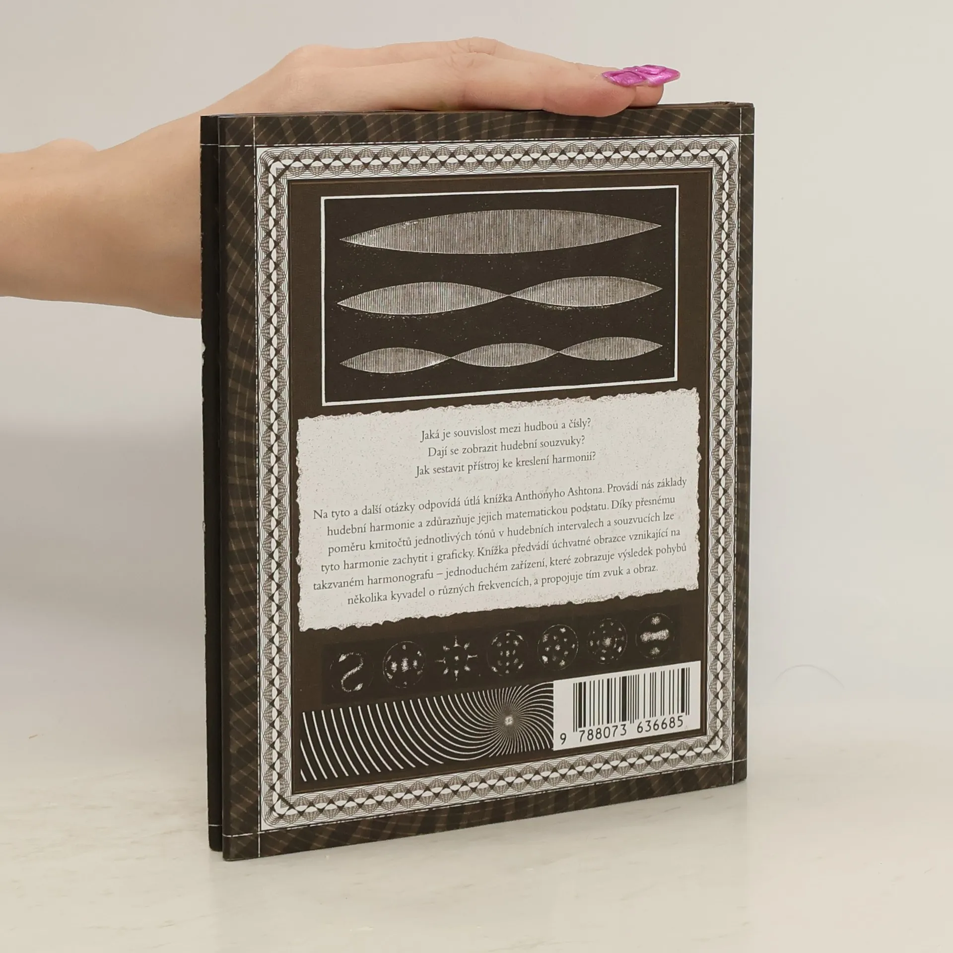 Jaká je souvislost mezi hudbou a čísly? Dají se zobrazit hudební souzvuky? Jak sestavit přístroj ke kreslení harmonií? Na tyto a další otázky odpovídá útlá knížka Anthonyho Ashtona. Provádí nás základy hudební harmonie a zdůrazňuje jejich matematickou podstatu. Díky přesnému poměru kmitočtů jednotlivých tónů v hudebních intervalech a souzvucích lze tyto harmonie zachytit i graficky. Knížka předvádí úchvatné obrazce vznikající na takzvaném harmonografu - jednoduchém zařízení, které zobrazuje výsledek pohybů několika kyvadel o různých frekvencích, a propojuje tím zvuk a obraz.