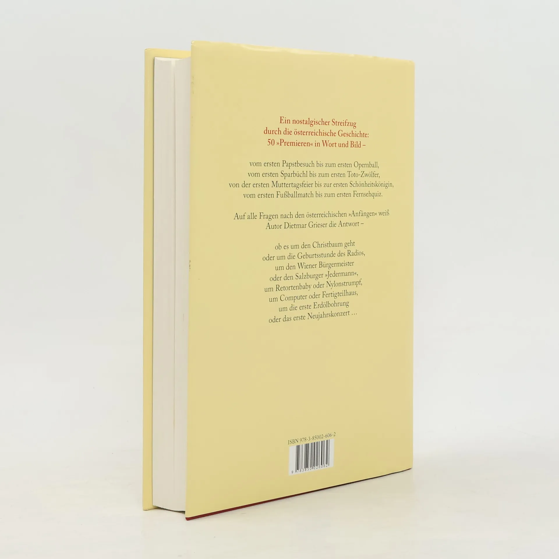 Ein nostalgischer Streifzug durch die österreichische Geschichte - 50 „Premieren“ in Wort und Bild: vom ersten Papstbesuch bis zum ersten Opernball, vom ersten Sparbüchl bis zum ersten Toto-Zwölfer, von der ersten Muttertagsfeier bis zur ersten Schönheitskönigin und vom ersten Fußballmatch bis zum ersten Fernsehquiz. Auf alle Fragen nach den österreichischen „Anfängen“ weiß Autor Dietmar Grieser die Antwort - ob es um den Christbaum geht oder um die Geburtsstunde des Radios, um den Wiener Bürgermeister oder den Salzburger „Jedermann“, um Retortenbaby oder Nylonstrumpf, um Computer oder Fertigteilhaus, um die erste Erdölbohrung oder das erste Neujahrskonzert.