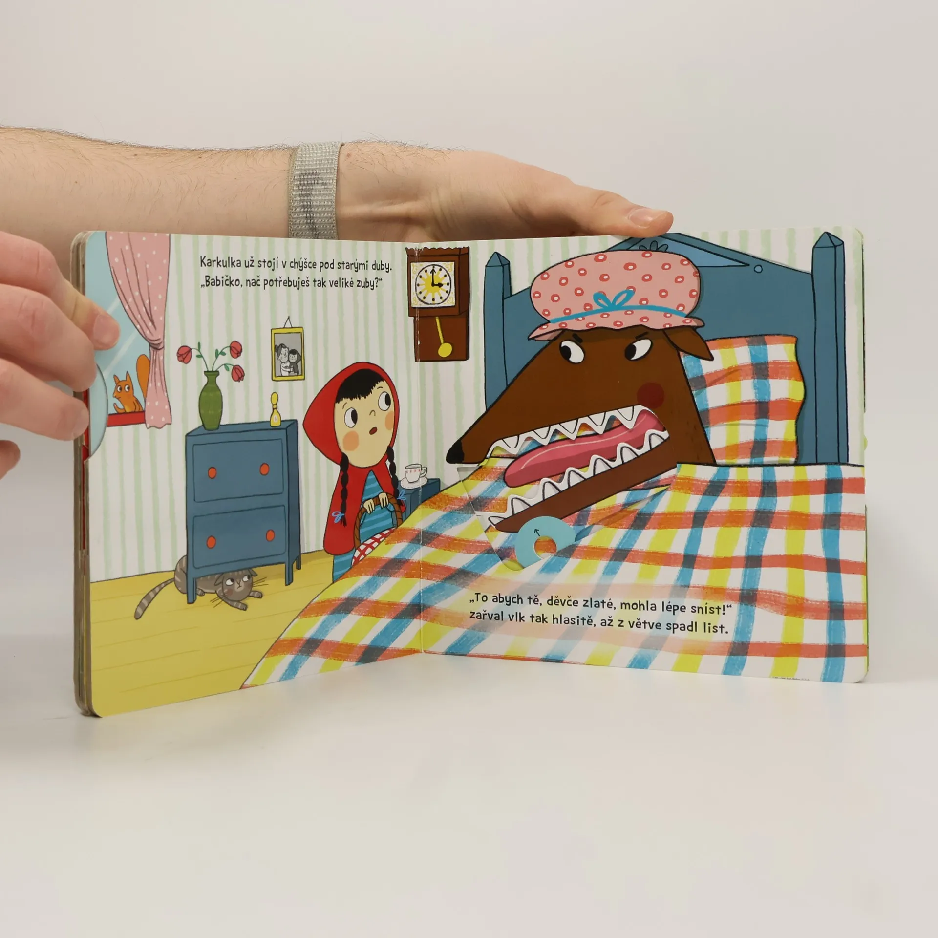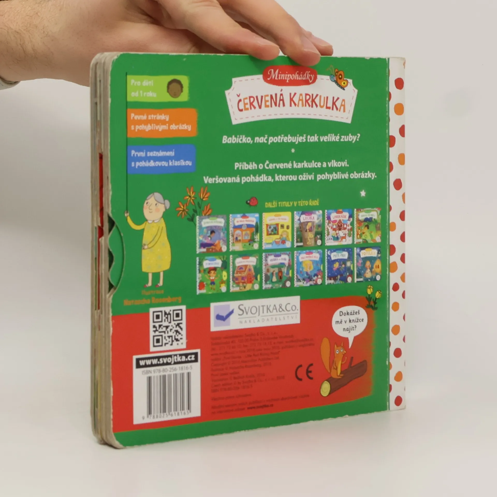 Tato veršovaná minipohádka je určena dětem od jednoho roku. Má pevné stránky s pohyblivými prvky, takže si děti mohou příběh oživit a procvičit si prstíky. Babičko, nač potřebuješ tak veliké zuby? Toto malé pohádkové leporelo s pevnými stránkami a pohyblivými obrázky je určeno dětem od jednoho roku a najdete v něm krátkou veršovanou pohádku o Červené karkulce a vlkovi. Při jejím poslouchání si děti mohou procvičovat svou jemnou motoriku a zároveň si pohádkový příběh oživit – před Červenou karkulkou se náhle objeví vlk, vycení obrovské zuby, ve strachu před myslivcem rychle utíká do lesa...Tak vzhůru do čtení! Minipohádka o Červené karkulce už na vás čeká!