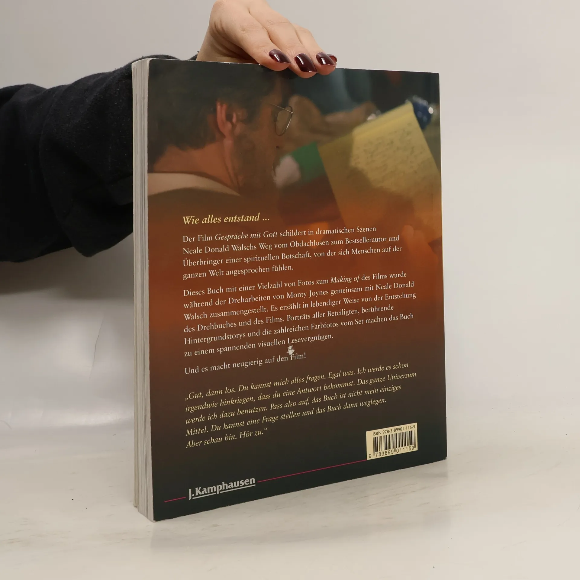 Wie alles entstand. *** Der Film „Gespräche mit Gott“ schildert in dramatischen Szenen Neale Donald Walschs Weg vom heruntergekommenen Obdachlosen zum Überbringer einer spirituellen Botschaft, von der Menschen auf der ganzen Welt sich angesprochen fühlen. Das Buch zum „Making of“ dieses Films wurde während der Dreharbeiten von Monty Joynes gemeinsam mit Neale Donald Walsch zusammengestellt. Es erzählt in lebendiger Weise über die Entstehung des Drehbuches und des Films, über Hindernisse und deren glückliche Lösungen, enthält Porträts aller Beteiligten an diesem Projekt (Produzenten, Schauspieler, Regisseure, Castingleute, Investoren, Kameraleute usw.) und wie es zu deren Mitwirkung kam – in teils berührenden Geschichten -, schildert einzelne Filmszenen, beschreibt Drehorte, rundum alles was zu den Dreharbeiten dazugehört. Zahlreiche Farbfotos vom Set und den Beteiligten machen das Buch zu einem spannenden visuellen Lesevergnügen. Und: es macht neugierig auf den Film! *** Das Buch über die Dreharbeiten zum Film „Gespräche mit Gott“ mit zahlreichen Farbfotos und vielen Geschichten vom Set.