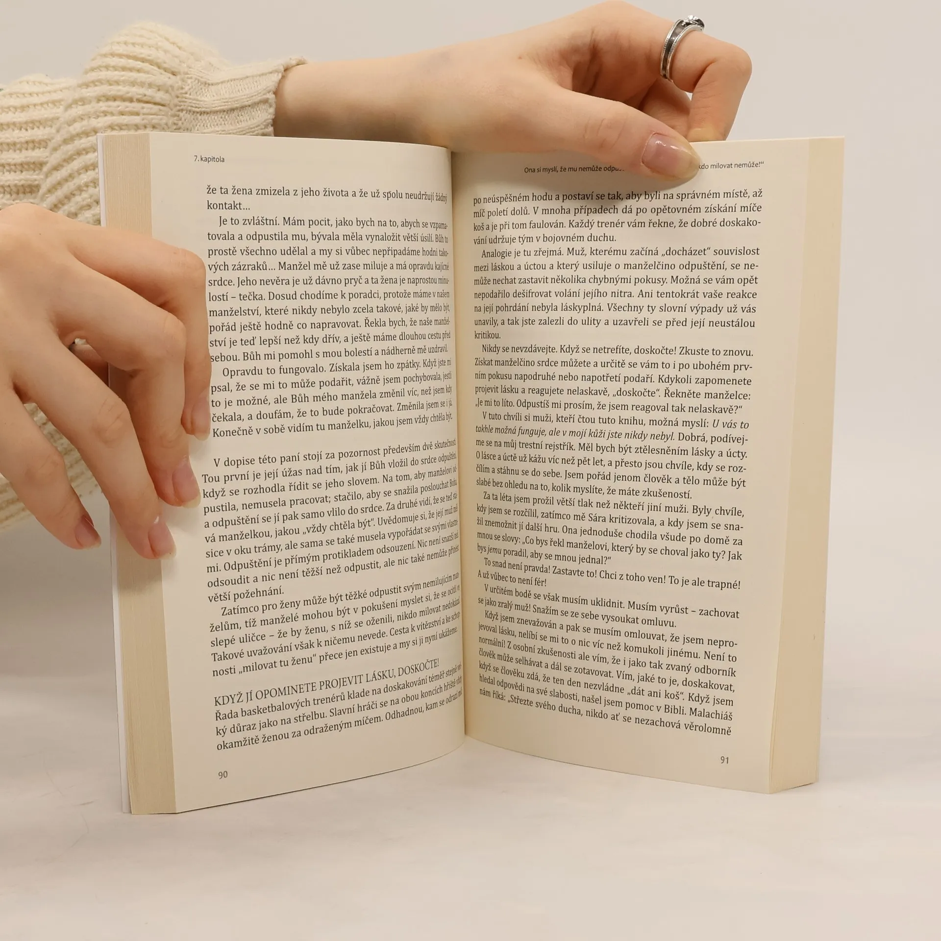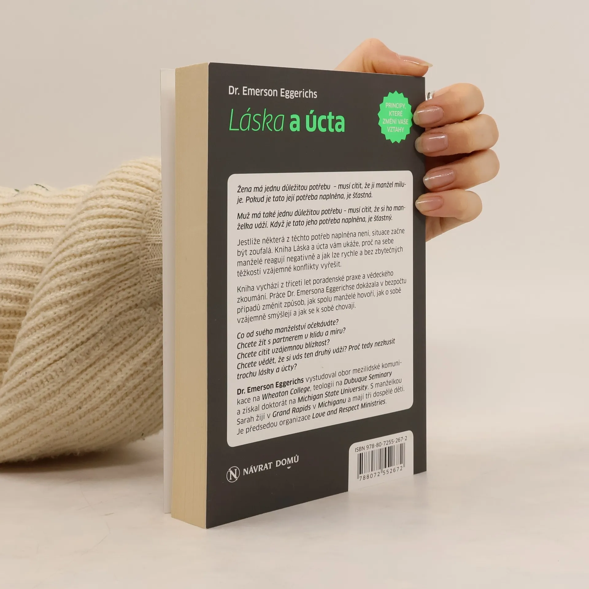Láska, po níž ona tolik touží. Úcta, kterou on tak zoufale potřebuje. Žena má jednu důležitou potřebu - musí cítit, že ji manžel miluje. Pokud je tato její potřeba naplněna, je šťastná. Muž má také jednu důležitou potřebu - musí cítit, že si ho manželka váží. Když je tato jeho potřeba naplněna, je šťastný. Jestliže některá z těchto potřeb naplněna není, situace začne být zoufalá. Kniha Láska a úcta vám ukáže, proč na sebe manželé reagují negativně a jak lze rychle a bez zbytečných těžkostí vzájemné konflikty vyřešit. Kniha vychází z třiceti let poradenské praxe a vědeckého zkoumání.