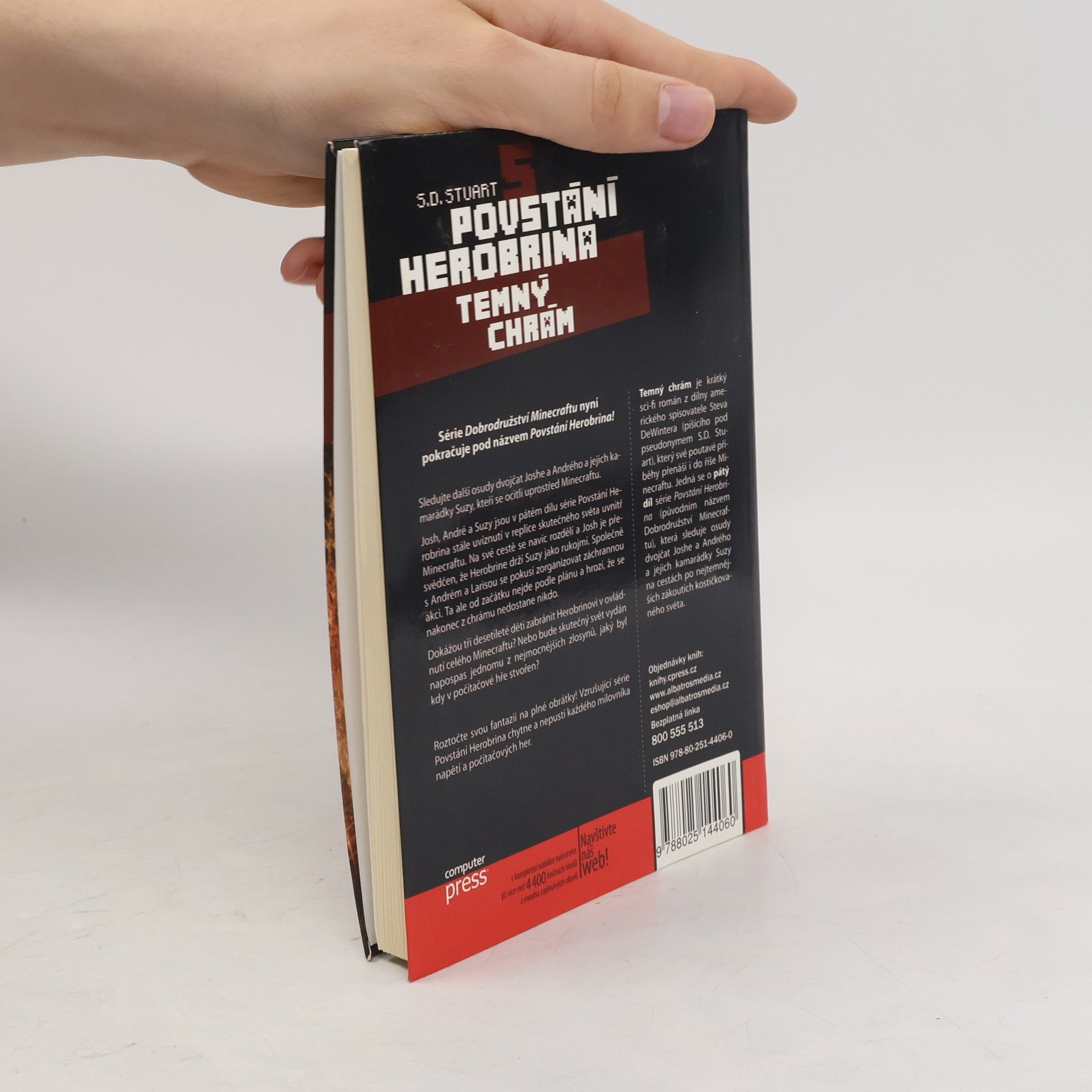 Série Dobrodružství Minecraftu nyní pokračuje pod názvem Povstání Herobrina! Sledujte další osudy dvojčat Joshe a Andrého a jejich kamarádky Suzy, kteří se ocitli uprostřed Minecraftu. Josh, André a Suzy jsou v pátém dílu série Povstání Herobrina stále uvíznutí v replice skutečného světa uvnitř Minecraftu. Na své cestě se navíc rozdělí a Josh je přesvědčen, že Herobrine drží Suzy jako rukojmí. Společně s Andrém a Larisou se pokusí zorganizovat záchrannou akci. Ta ale od začátku nejde podle plánu a hrozí, že se nakonec z chrámu nedostane nikdo. Dokážou tři desetileté děti zabránit Herobrinovi v ovládnutí celého Minecraftu? Nebo bude skutečný svět vydán napospas jednomu z nejmocnějších zlosynů, jaký byl kdy v počítačové hře stvořen? Roztočte svou fantazii na plné obrátky! Vzrušující série Povstání Herobrina chytne a nepustí každého milovníka napětí a počítačových her. Temný chrám je krátký sci-fi román z dílny amerického spisovatele Steva DeWintera (píšícího pod pseudonymem S.D. Stuart), který své poutavé příběhy přenáší i do říše Minecraftu. Jedná se o pátý díl série Povstání Herobrina (původním názvem Dobrodružství Minecraftu), která sleduje osudy dvojčat Joshe a Andrého a jejich kamarádky Suzy na cestách po nejtemnějších zákoutích kostičkovaného světa.