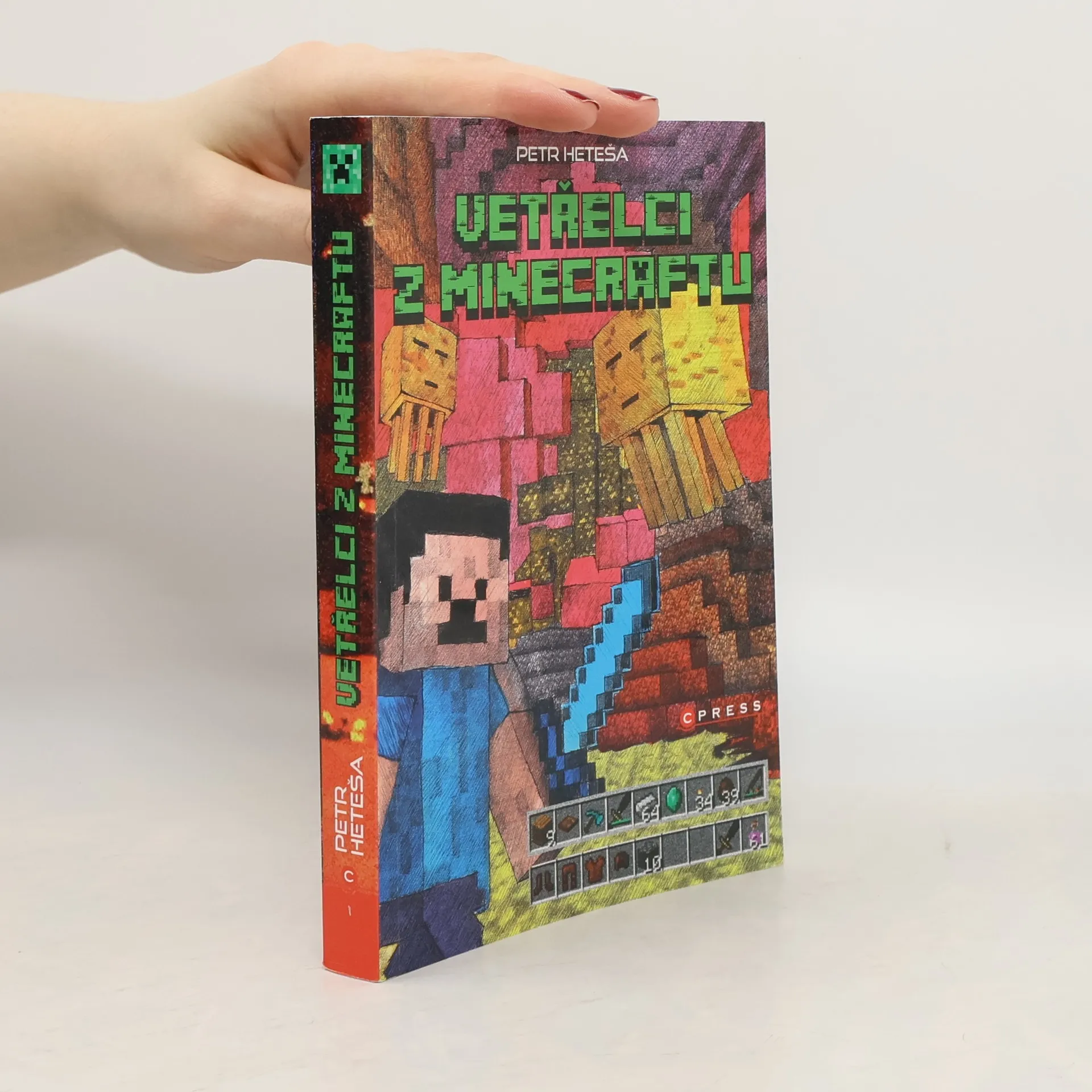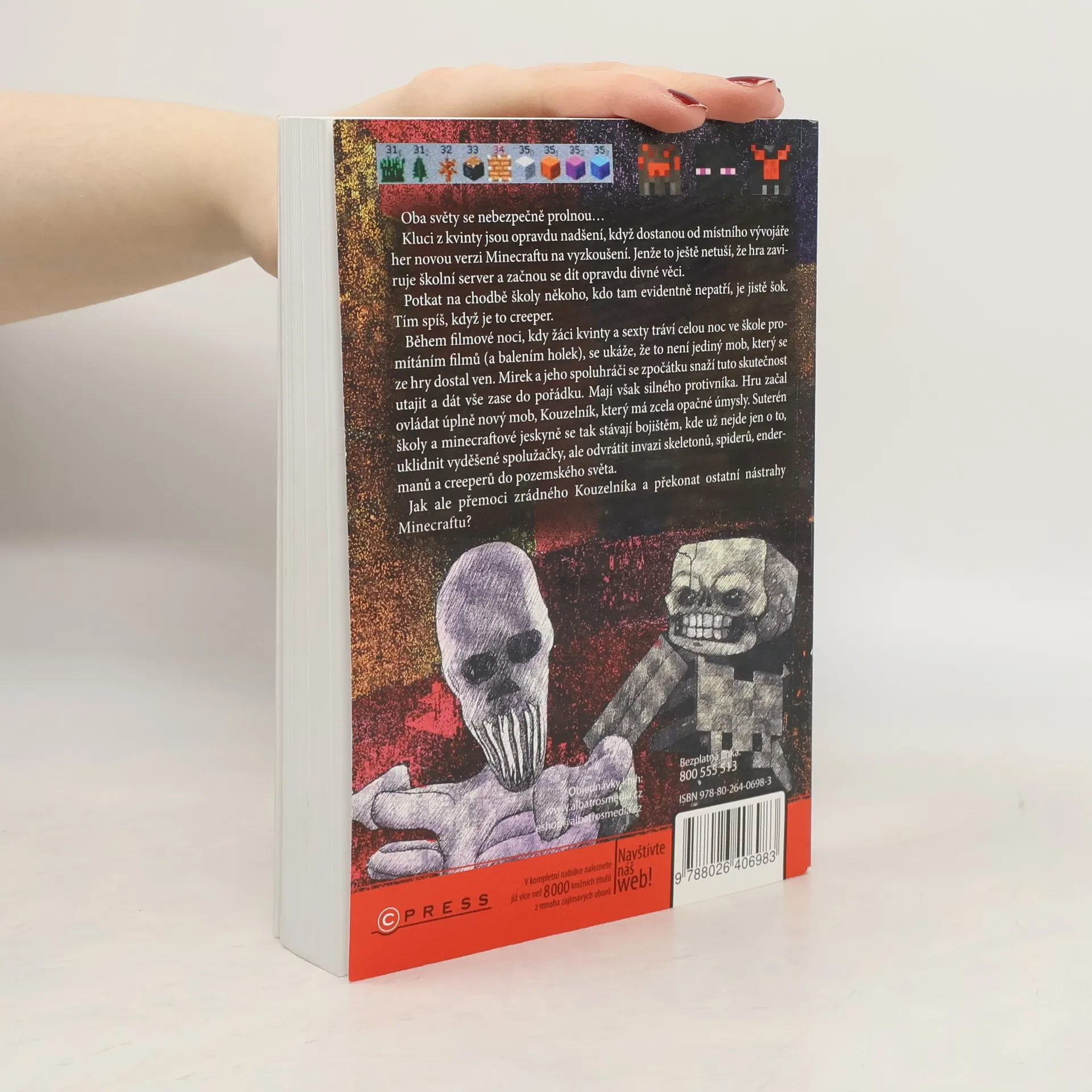 Kluci a holky dobrovolně otvírají knihu, místo aby strávili další odpoledne u počítače. Myslíte si, že je to sci-fi? Nikoliv. To jsou VETŘELCI Z MINECRAFTU! Napínavý a dech beroucí příběh na motivy světoznámé počítačové hry pohltí každého milovníka akce, nebezpečí, humoru a překvapivých zvratů ve věku od 10 do 15 let. Kluci z kvinty jsou opravdu nadšení, když dostanou od místního vývojáře her novou verzi Minecraftu na odzkoušení. Jenže to ještě netuší, že hra zaviruje školní server a začnou se dít opravdu divné věci. Potkat na chodbě školy někoho, kdo tam evidentně nepatří, je jistě šok. Tím spíš, když je to creeper. Během filmové noci, kdy žáci kvinty a sexty tráví celou noc ve škole promítáním filmů (a balením holek), se ukáže, že to není jediný mob, který se ze hry dostal ven. Mirek a jeho spoluhráči se zpočátku snaží tuto skutečnost utajit a dát vše zase do pořádku. Jenže mají silného protivníka. Hru začal ovládat úplně nový mob, Kouzelník, který má zcela opačné úmysly. Oba světy se nebezpečně prolnou. Suterén školy a minecraftové jeskyně se tak stávají bojištěm, kde už nejde jen o to, uklidnit vyděšené spolužačky, ale odvrátit invazi skeletonů, spiderů, endermanů a creeperů do pozemského světa. Podaří se partě známých hráčů přemoci zrádného Kouzelníka a ostatní nástrahy Minecraftu? ISBN pro soubor: 978-80-264-0870-3