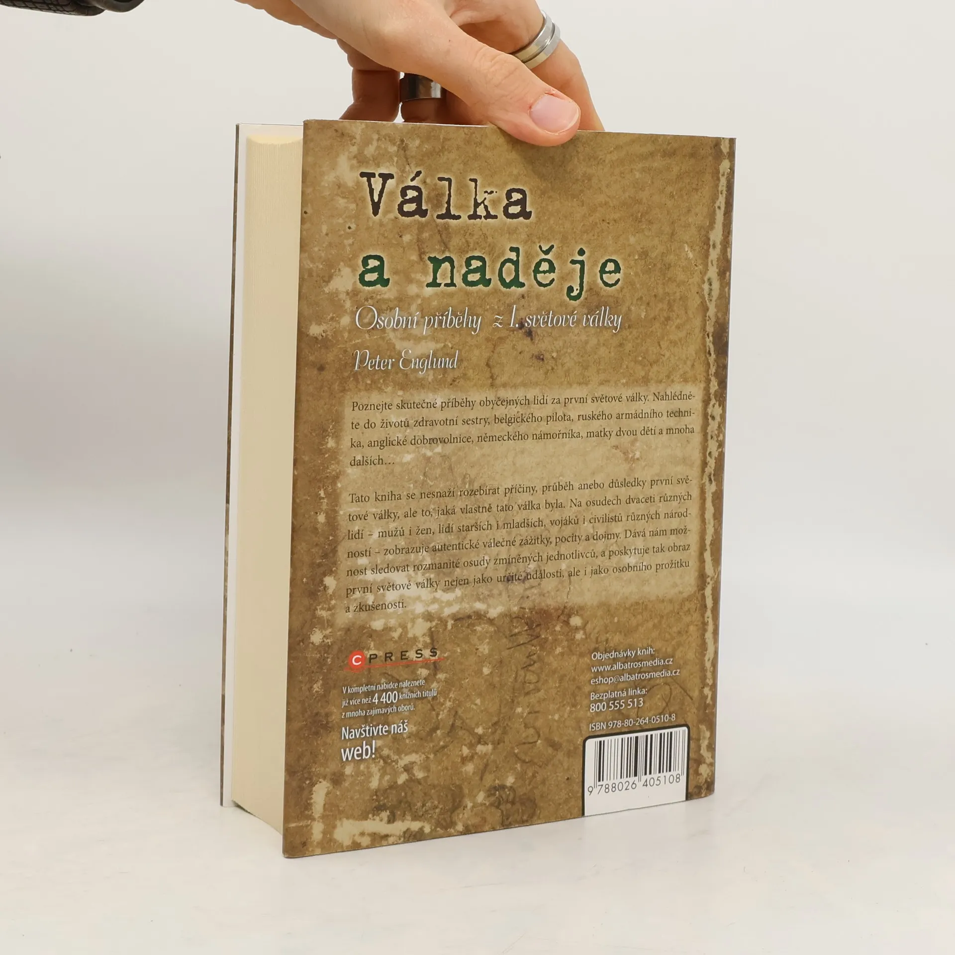 Podtitul: Osobní příběhy z I. světové války. Výjimečná kniha o první světové válce, která se nesnaží rozebírat její příčiny, průběh anebo důsledky, ale popsat, jaká vlastně byla. Na osudech dvaceti různých lidí – mužů i žen, lidí starších i mladších, vojáků i civilistů různých národností – představuje autentické válečné zážitky, pocity i dojmy. Dává nám možnost sledovat rozmanité osudy zmíněných jednotlivců, a poskytuje tak obraz první světové války nejen jako určité události, ale i jako osobního prožitku a zkušenosti.