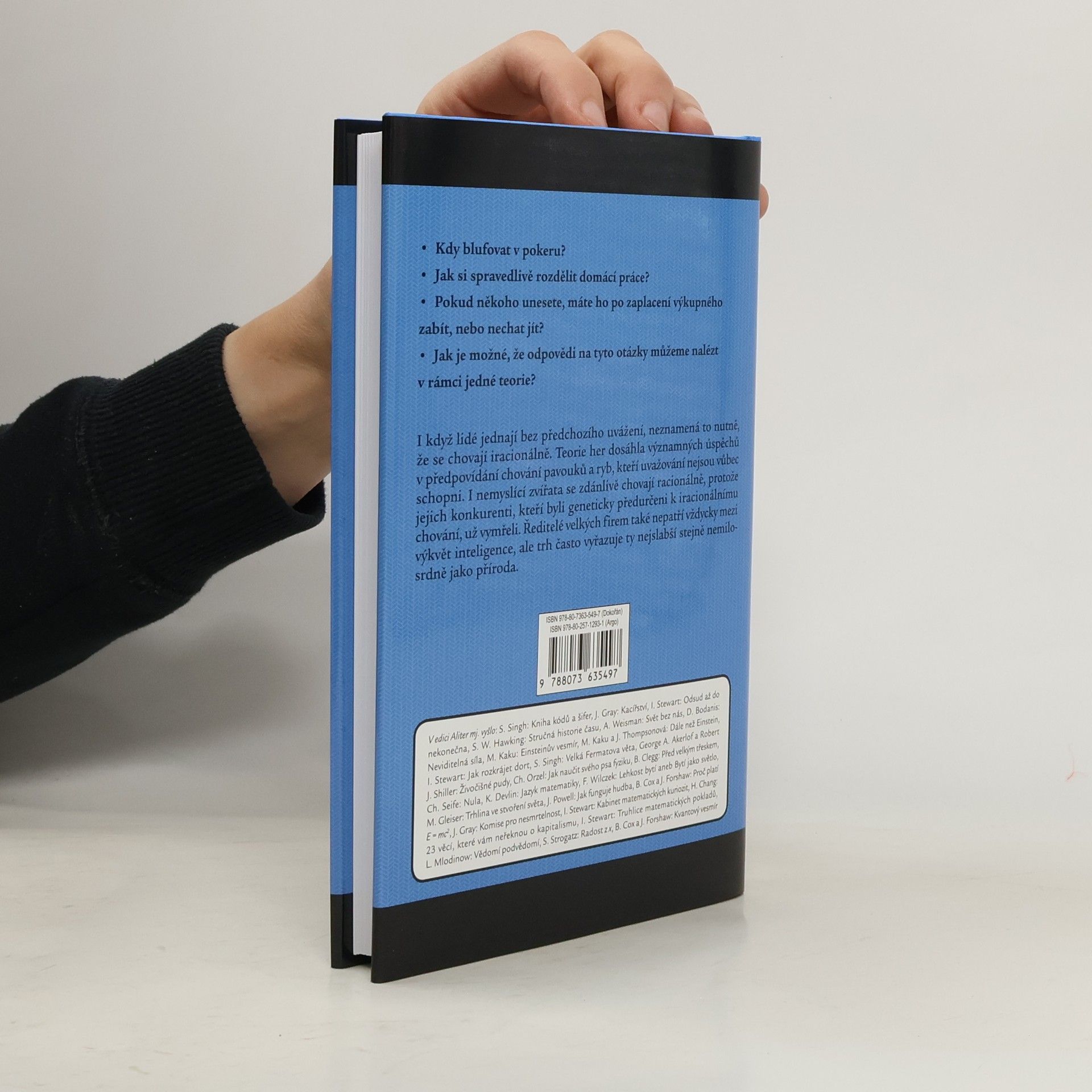 ... a jak může změnit váš život. Pokaždé, když se setkají dva lidé, hrají spolu nějakou hru – nebo aspoň pokaždé, když mají cíle, kterých chtějí dosáhnout, a strategie, které k tomu mohou využít. Hry tedy hrají úplně všichni – obchodníci s akciemi i řidiči v dopravní špičce, vězni na útěku i účastníci internetových aukcí, zamilované páry při romantických námluvách i politici při vyhlašování ultimát. Teorie her studuje otázky, které jsou všem těmto hrám společné, například jak budou postupovat racionální hráči či jak předvídat výsledek hry. Tato poutavě napsaná kniha umožní pochopit teorii her bez složitého matematického aparátu. Ukazuje, jak lze z několika jednoduchých předpokladů vybudovat značně složitou teorii, která – i když byla původně určena pro aplikace v ekonomii – stačila za svoji relativně krátkou dobu existence ovlivnit natolik rozdílné obory, jako je politologie a etika na jedné straně a evoluční biologie na straně druhé.