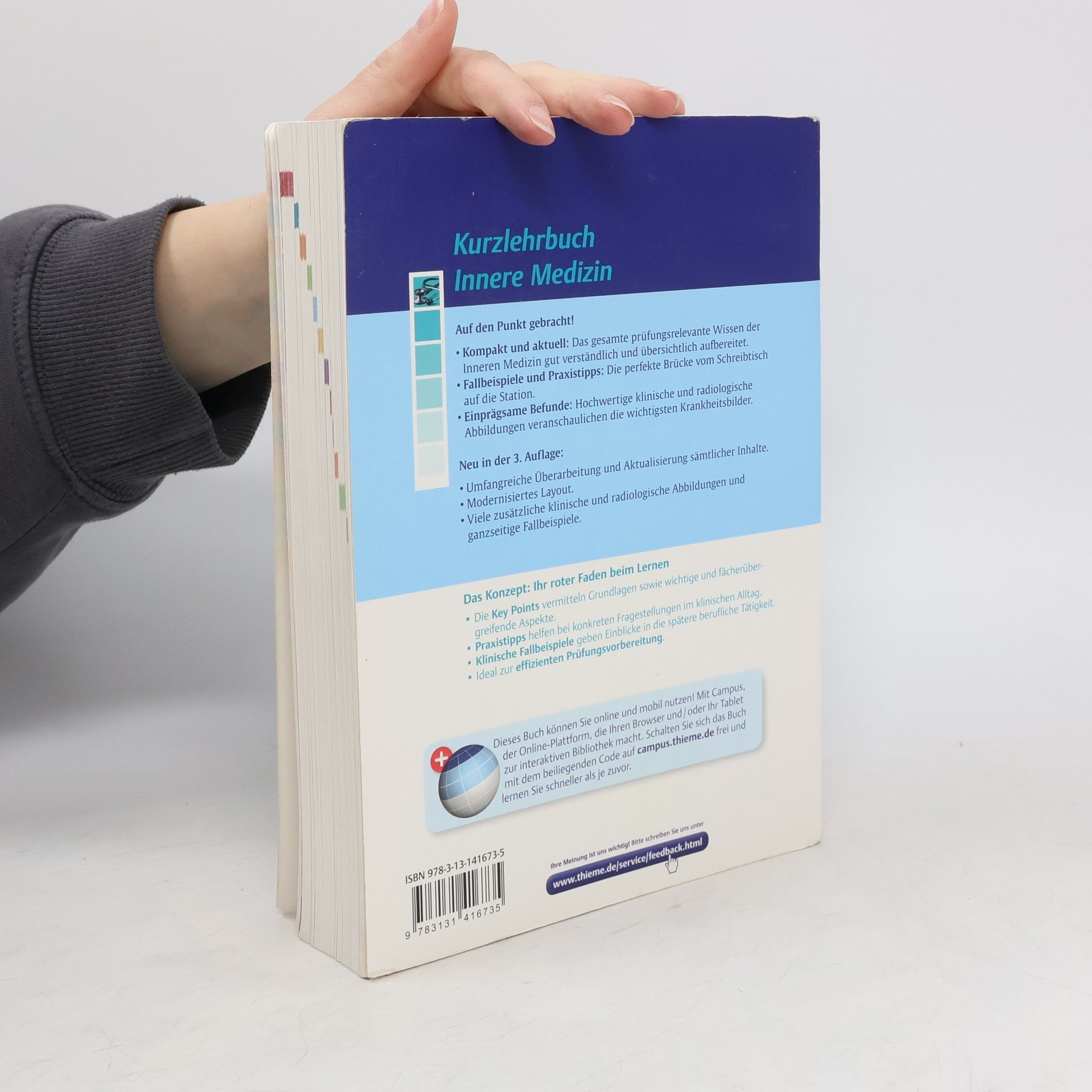 Auf den Punkt gebracht! Das gesamte prüfungsrelevante Wissen der Inneren Medizin ist in diesem Kurzlehrbuch kompakt, gut verständlich und übersichtlich aufbereitet. Fallbeispiele und Praxistipps: Die perfekte Brücke vom Schreibtisch auf die Station. Hochwertige klinische und radiologische Abbildungen veranschaulichen einprägsam die wichtigsten Krankheitsbilder. Neu in der 3. Auflage: - Alle Inhalte umfangreich überarbeitet und aktualisiert, - modernes Layout, - viele zusätzliche klinische und radiologische Abbildungen und - zahlreiche ganzseitige Fallbeispiele. Jederzeit zugreifen: Der Inhalt des Buches steht Ihnen auch digital im Wissensportal eRef und in der eRef App zur Verfügung.