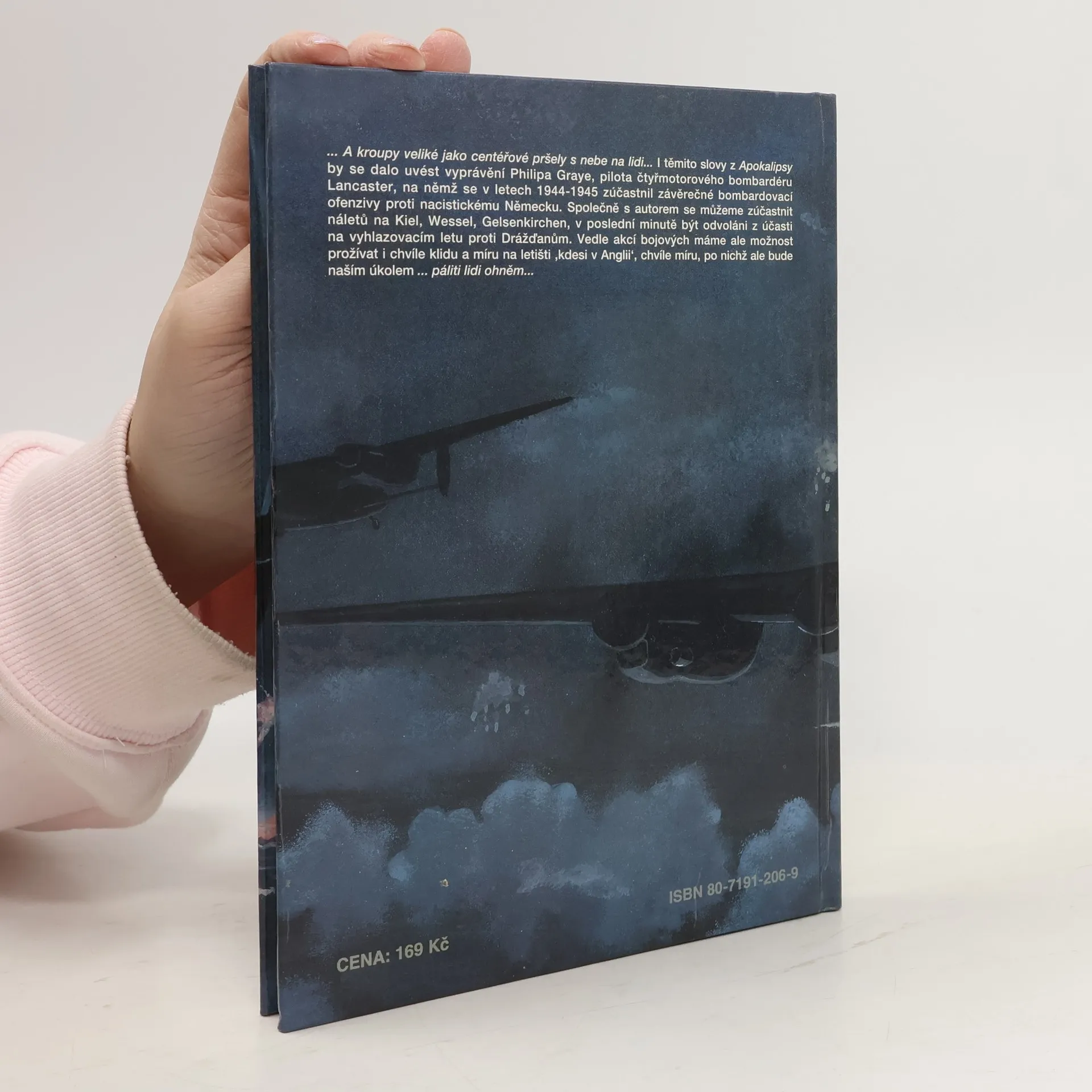 ... A kroupy veliké jako centéřové pršely s nebe na lidi… I těmito slovy z Apokalypsy by se dalo uvést vyprávění Philipa Graye, pilota čtyřmotorového bombardéru Lancaster, na němž se v letech 1944 - 1945 zúčastnil závěrečné bombardovací ofenzivy proti nacistickému Německu. Společně s autorem se můžeme zúčastnit náletů na Kiel, Wessel, Gelsenkirchen, v poslední minutě být odvoláni z účasti na vyhlazovacím náletu proti Drážďanům. Vedle akcí bojových máme ale možnost prožívat i chvíle klidu a míru na letišti "kdesi v Anglii", chvíle míru, po nichž ale bude naším úkolem ... pálit lidi ohněm...... celý text